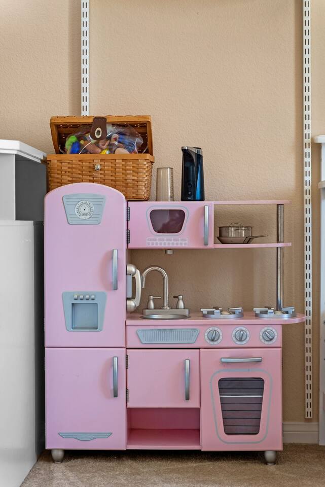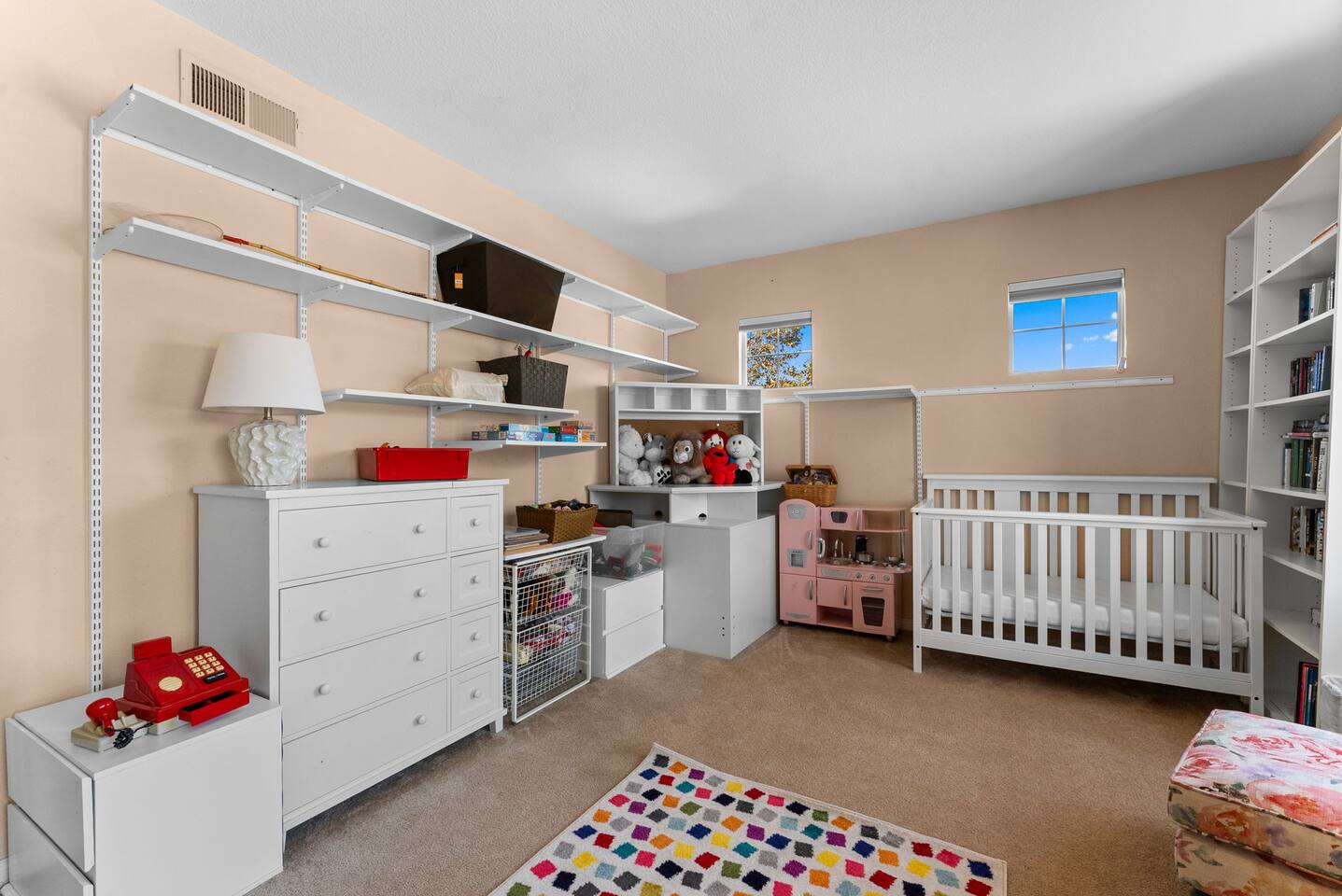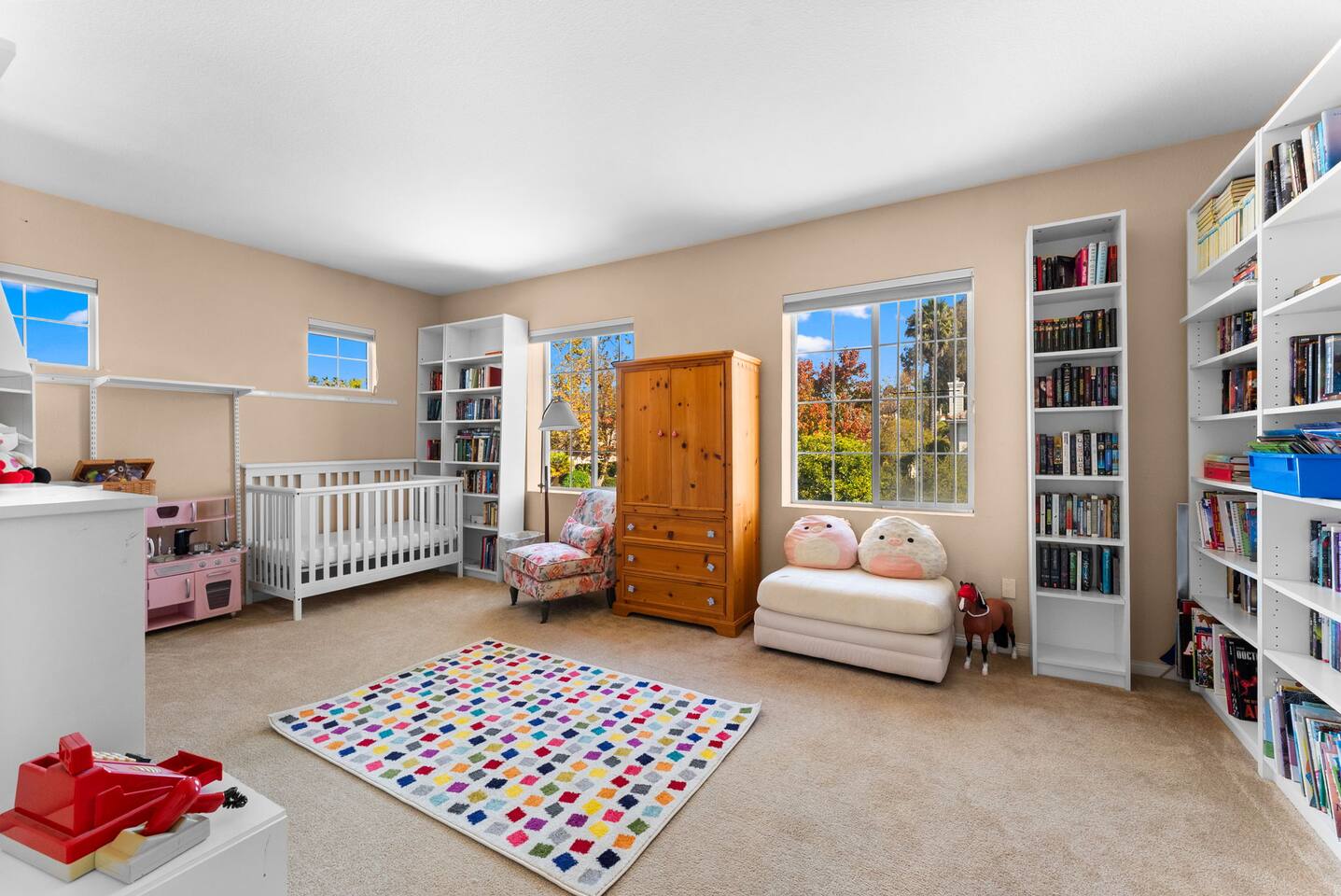 Bedroom 4: Playroom with full-size crib, toys, books, and blackout shades