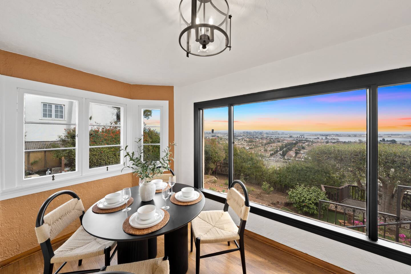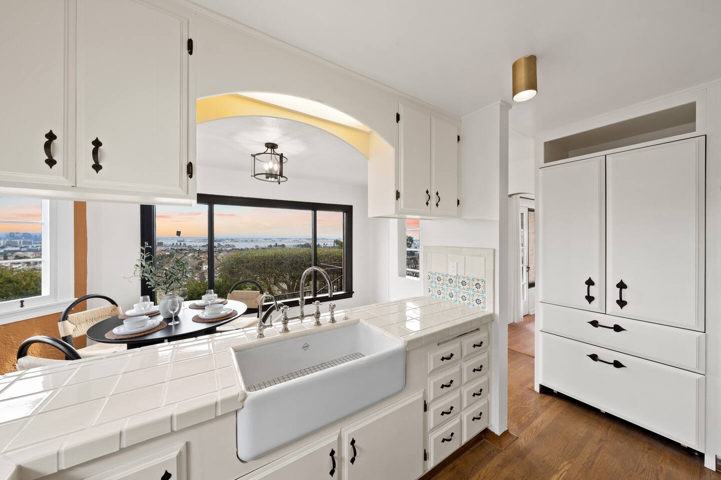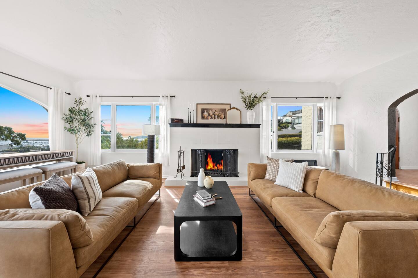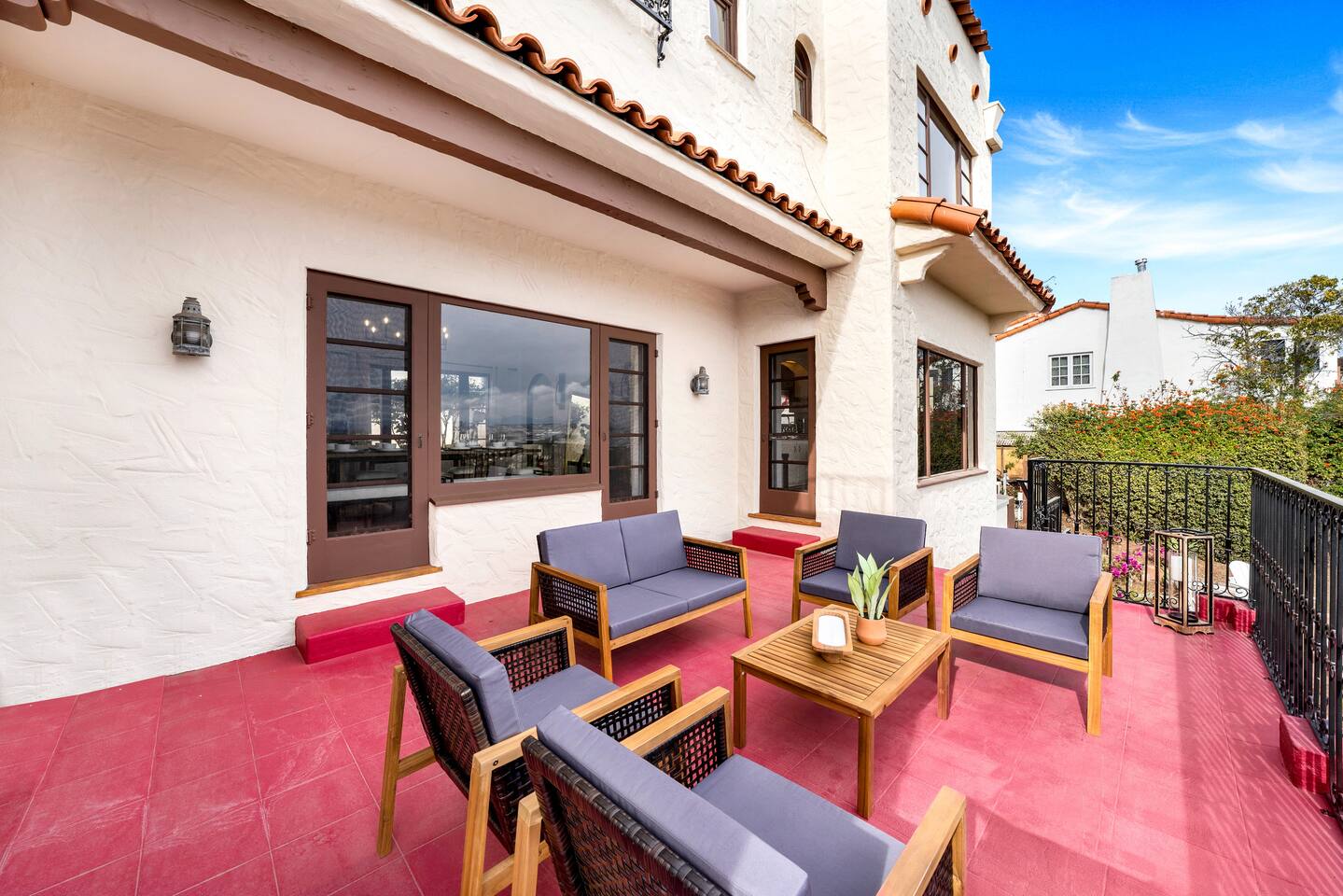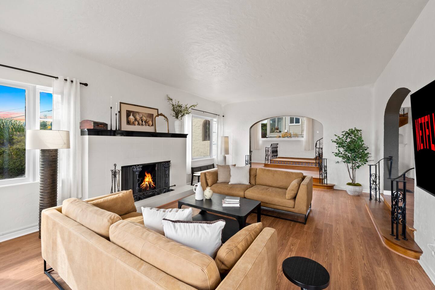 Step inside to the warmth of true California craftsmanship — arched doorways, original Spanish tiles, wrought-iron railings, and rich hardwood floors. The spacious living room sets the tone, inviting you to gather as a group and take in panoramic views that stretch across the city and bay.