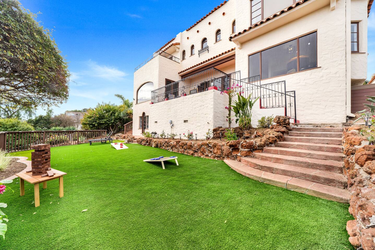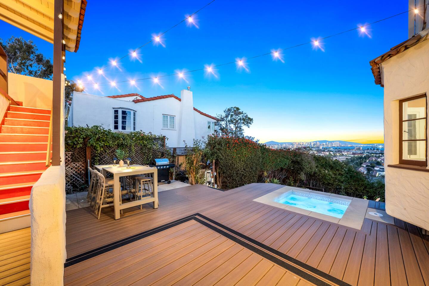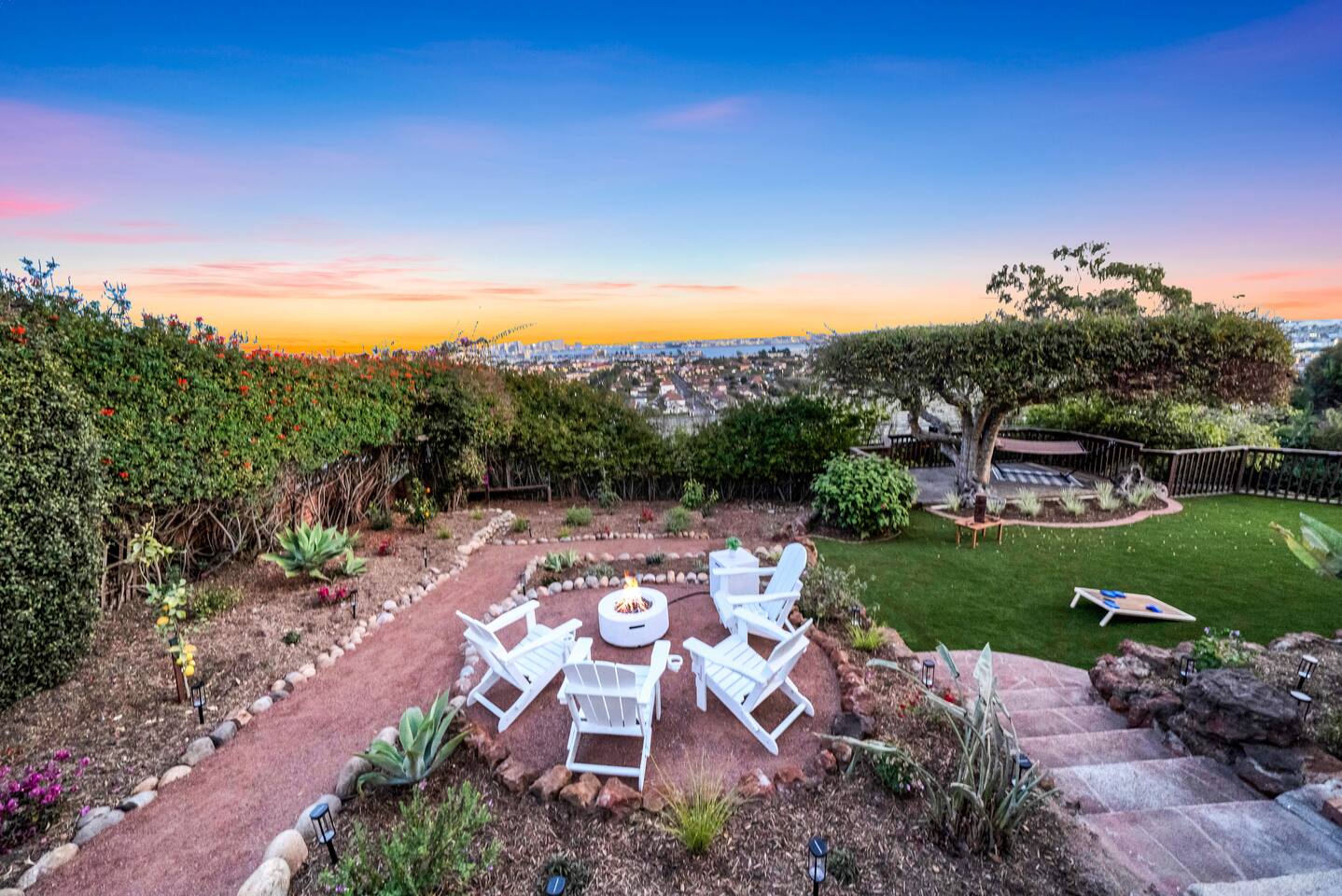 Outside, the magic continues. Step from the kitchen to your built-in hot tub overlooking the bay — the perfect place to unwind as the sun sets and city lights sparkle below. The spacious backyard features a manicured lawn for yard games, a fire pit for evening chats, and multiple outdoor living areas designed for relaxation and entertaining.