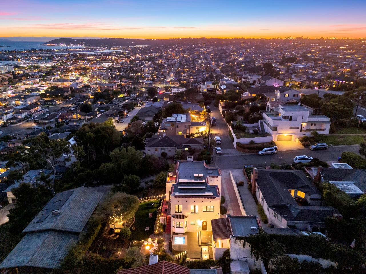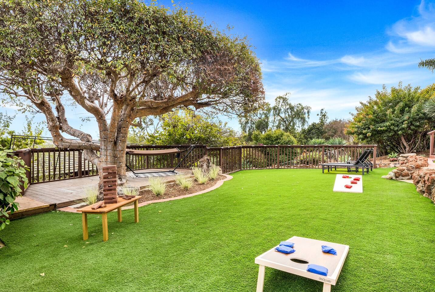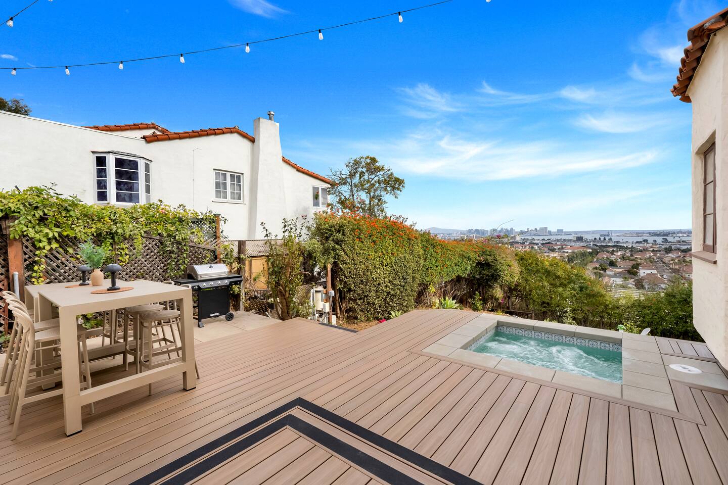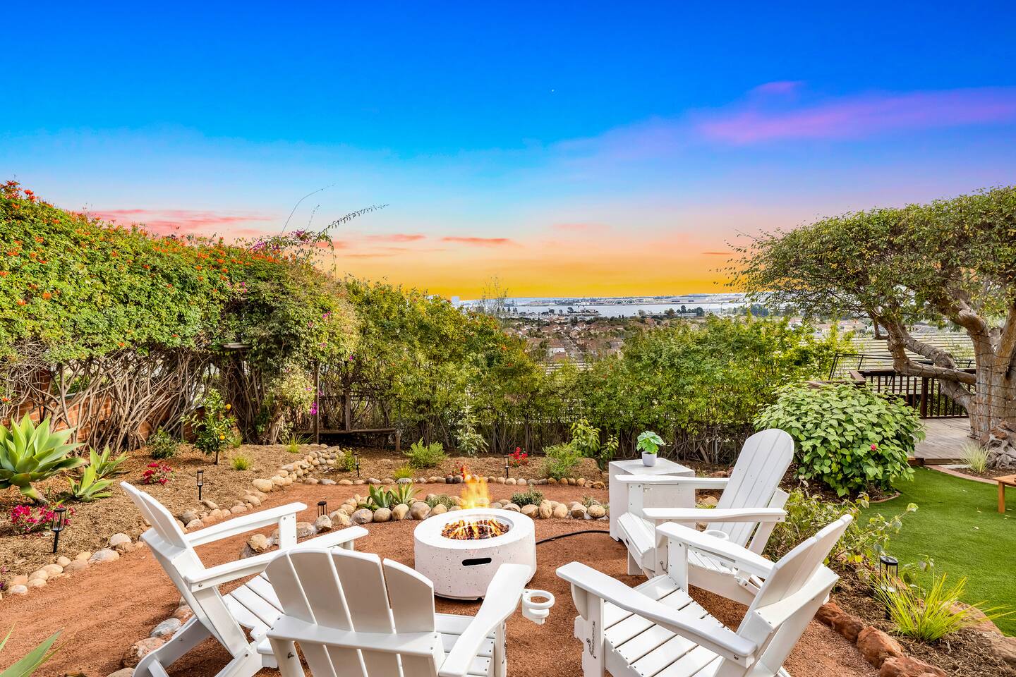 Outside, the magic continues. Step from the kitchen to your built-in hot tub overlooking the bay — the perfect place to unwind as the sun sets and city lights sparkle below. The spacious backyard features a manicured lawn for yard games, a fire pit for evening chats, and multiple outdoor living areas designed for relaxation and entertaining.