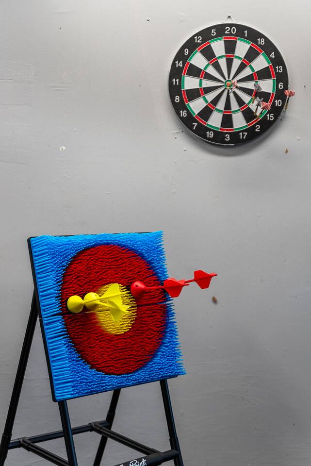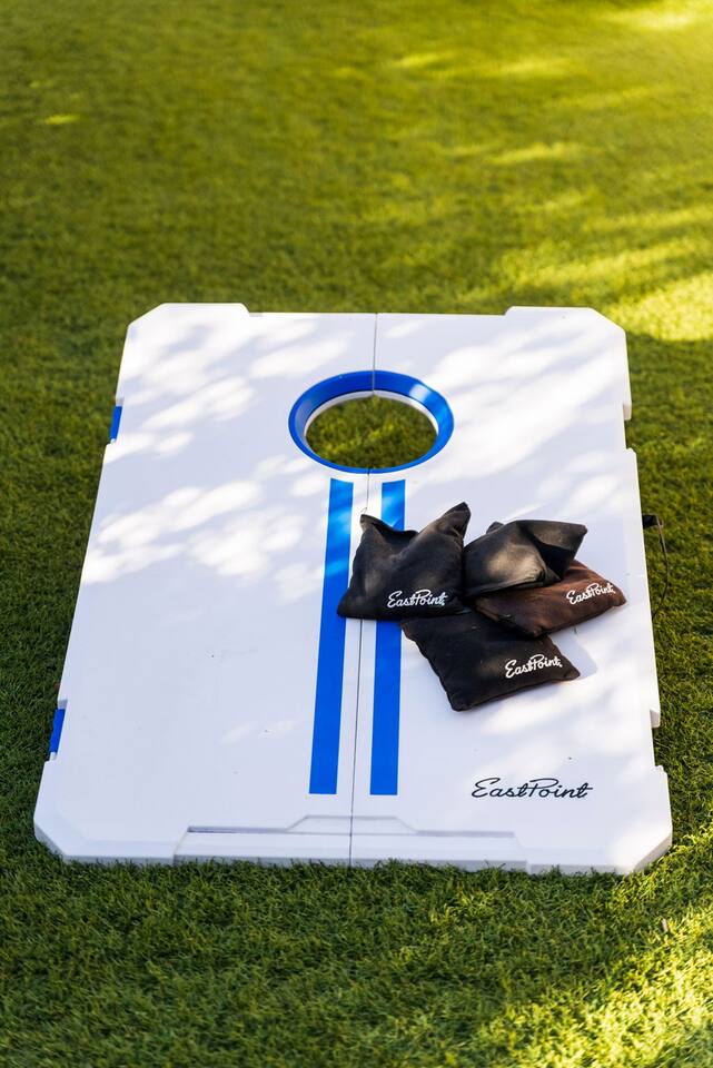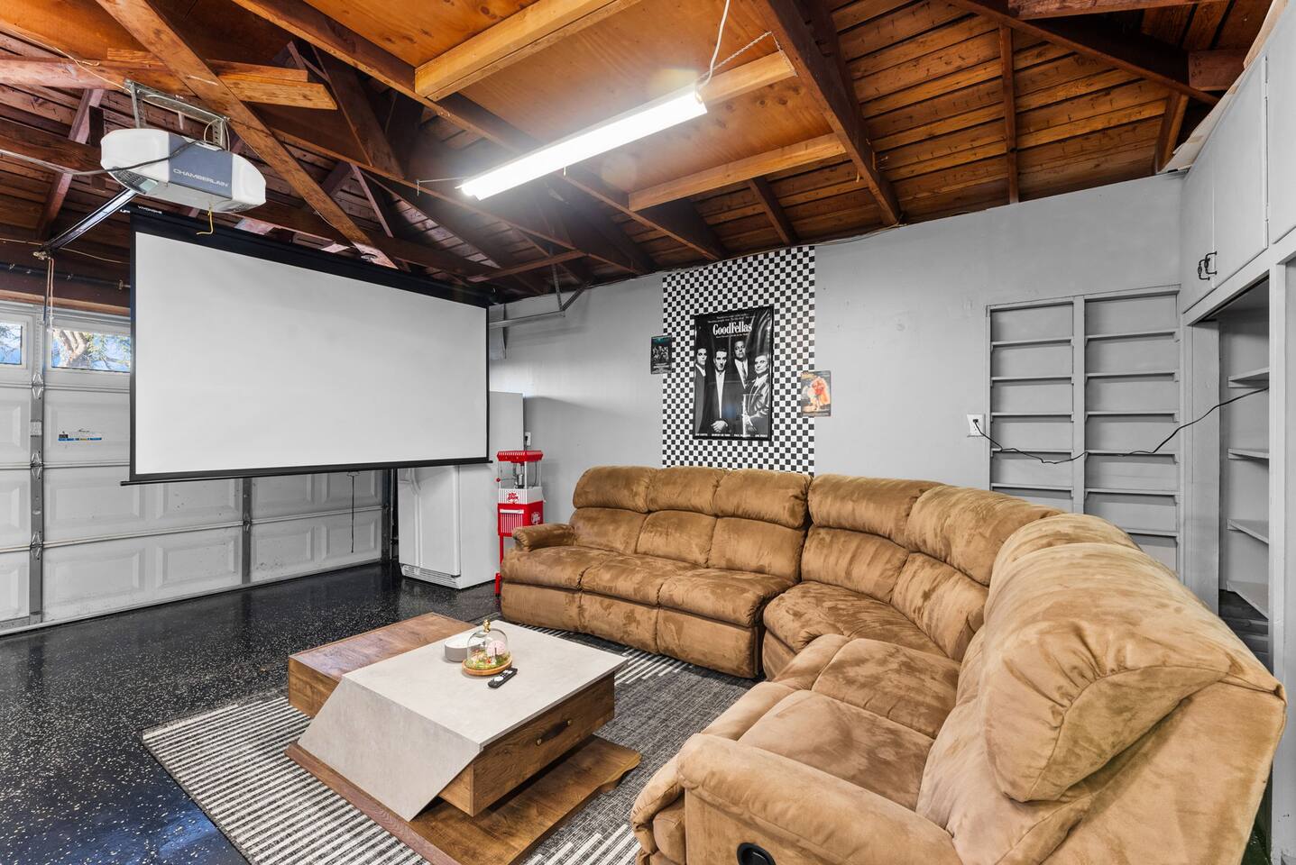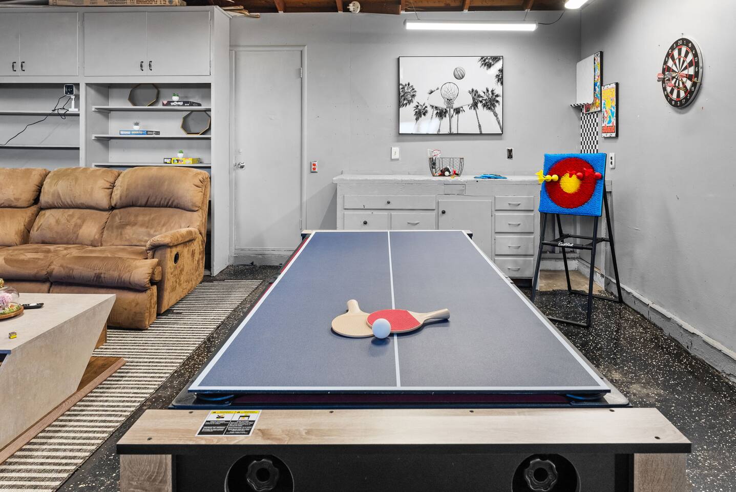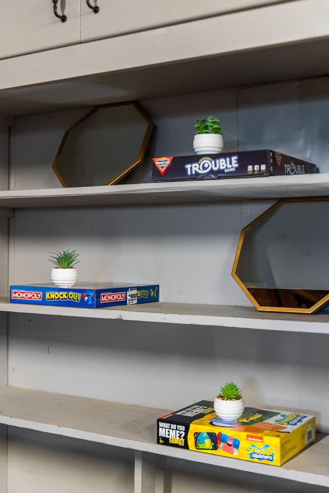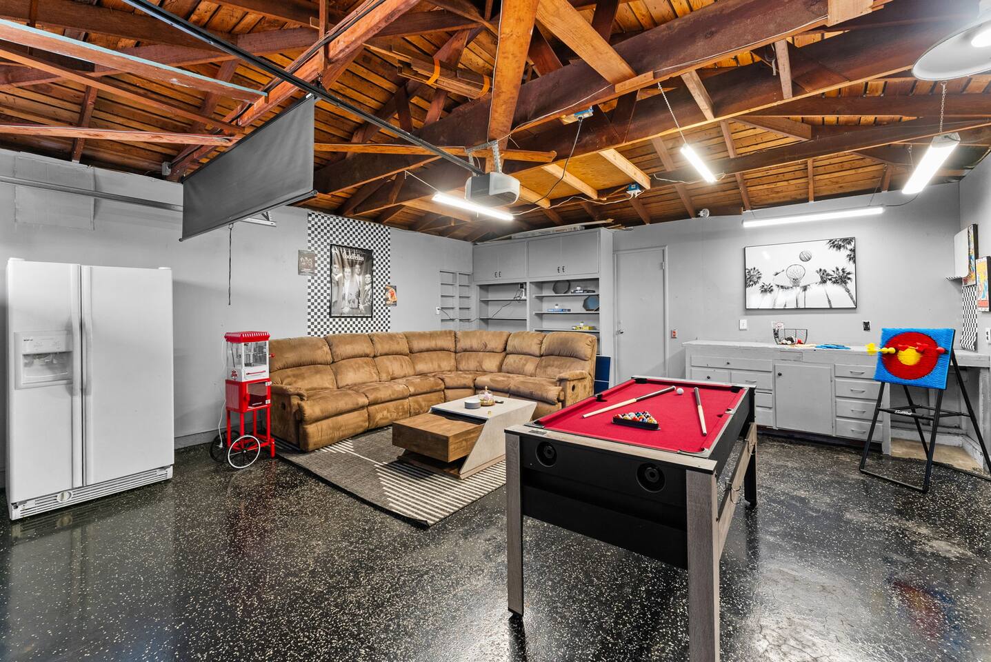 Inside, the garage has been transformed into a full game room that’s a hit with both kids and adults. Settle in for movie nights with a projector and cozy seating (complete with a popcorn machine), test your skills with axe throwing, or rotate between mini pool, air hockey, and ping pong on the convertible game table. Board games round out the fun for rainy days or late-night laughs.