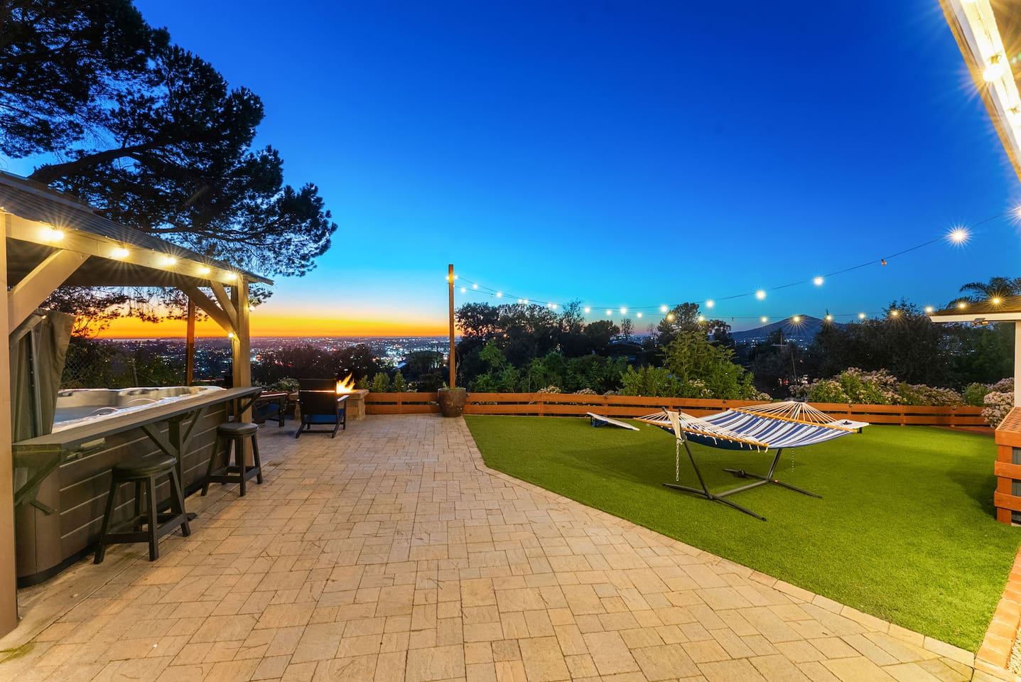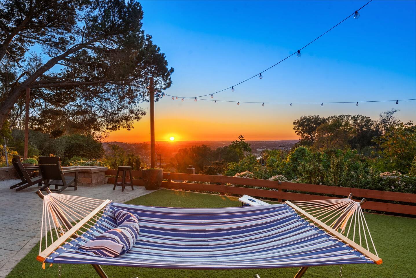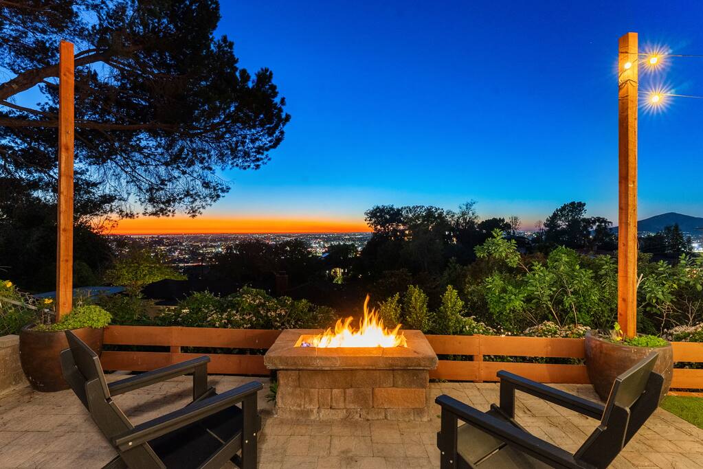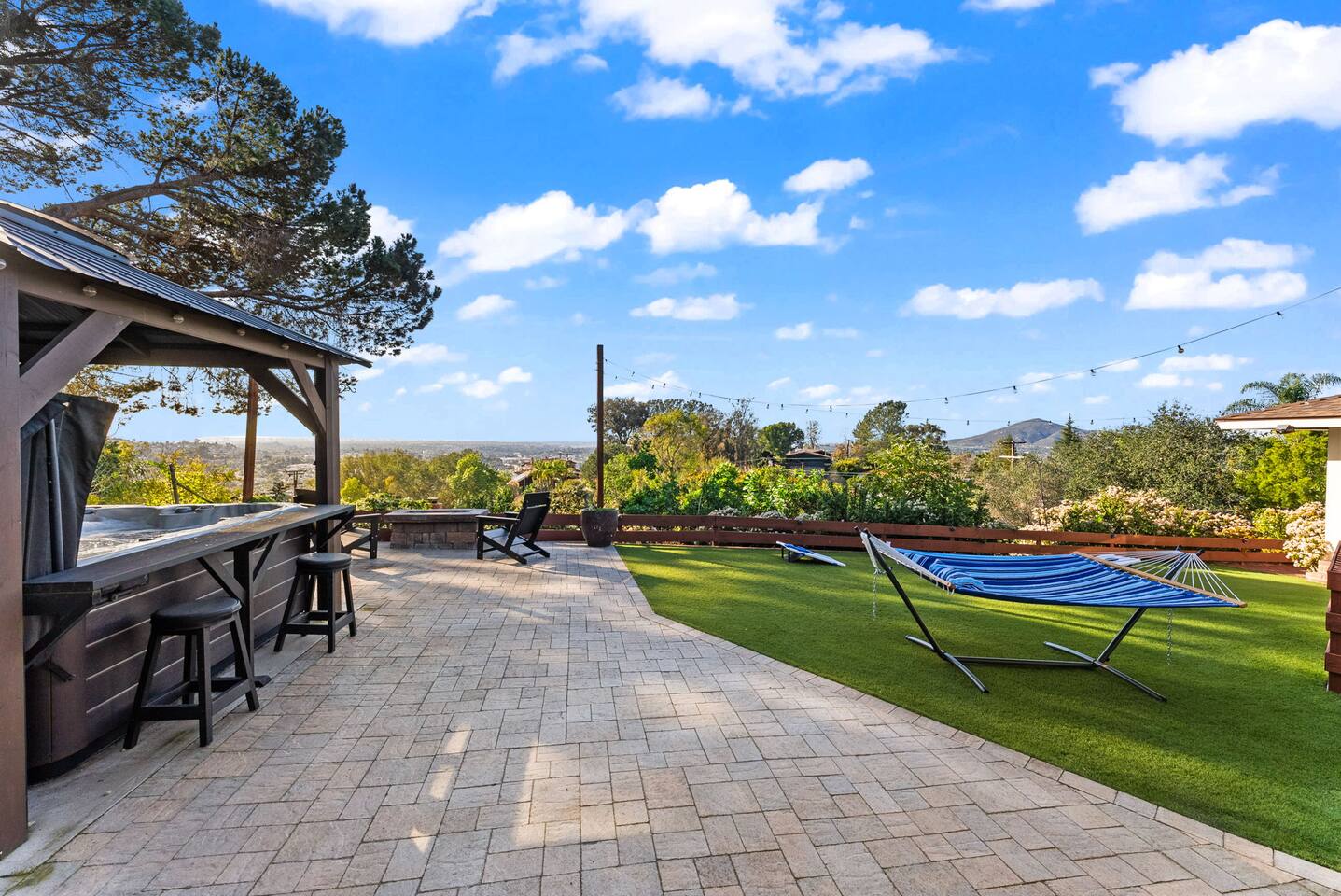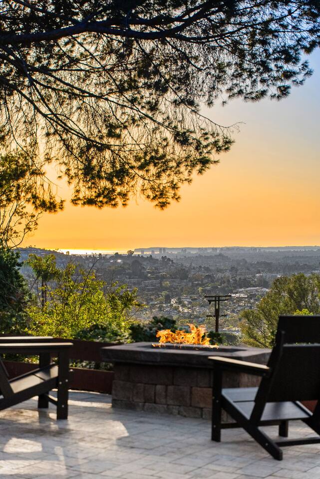 The backyard is all about relaxing and taking in the view. Sink into the hot tub once the sun goes down or during cooler winter nights, sway in the hammock, or challenge each other to a game of cornhole. End the night around the view fire pit, watching the lights of San Diego sparkle below.