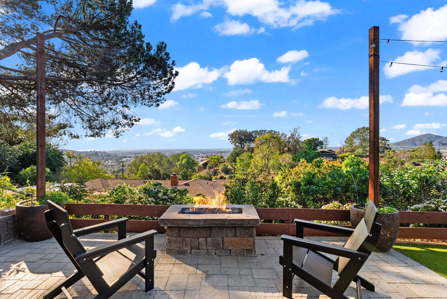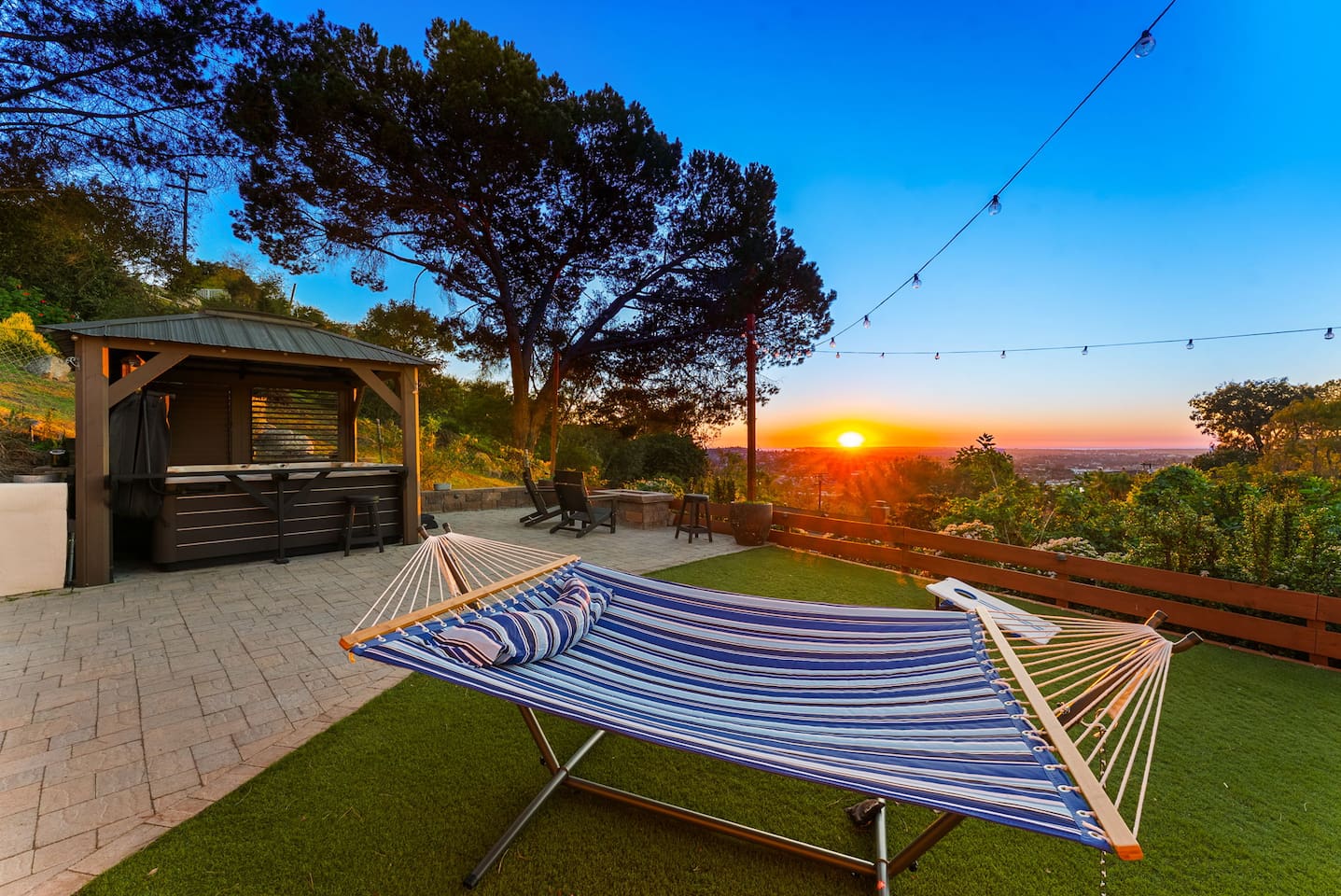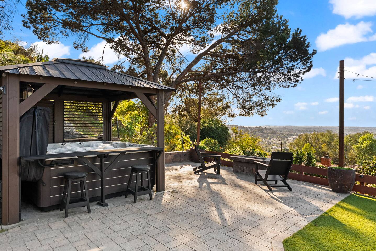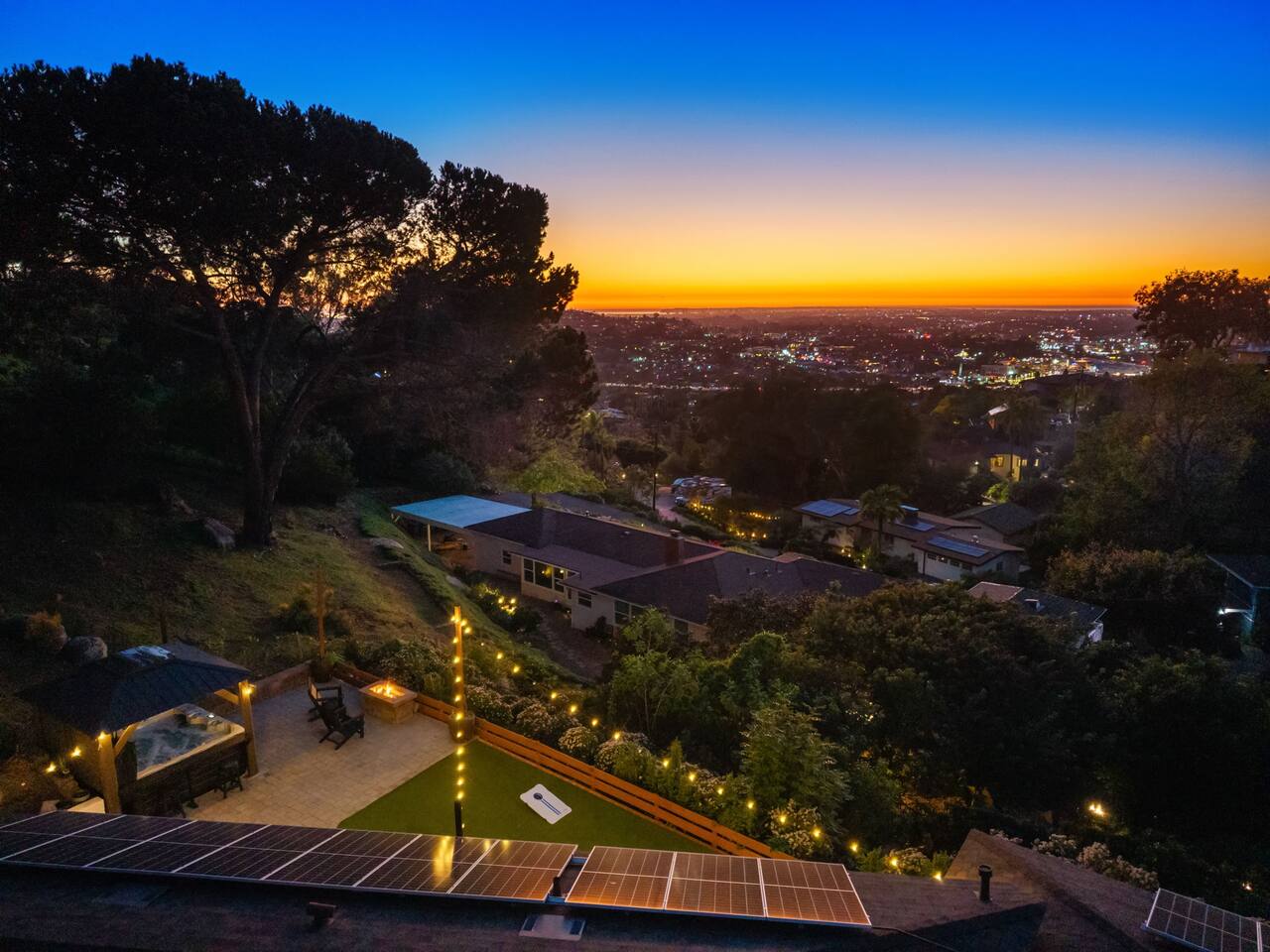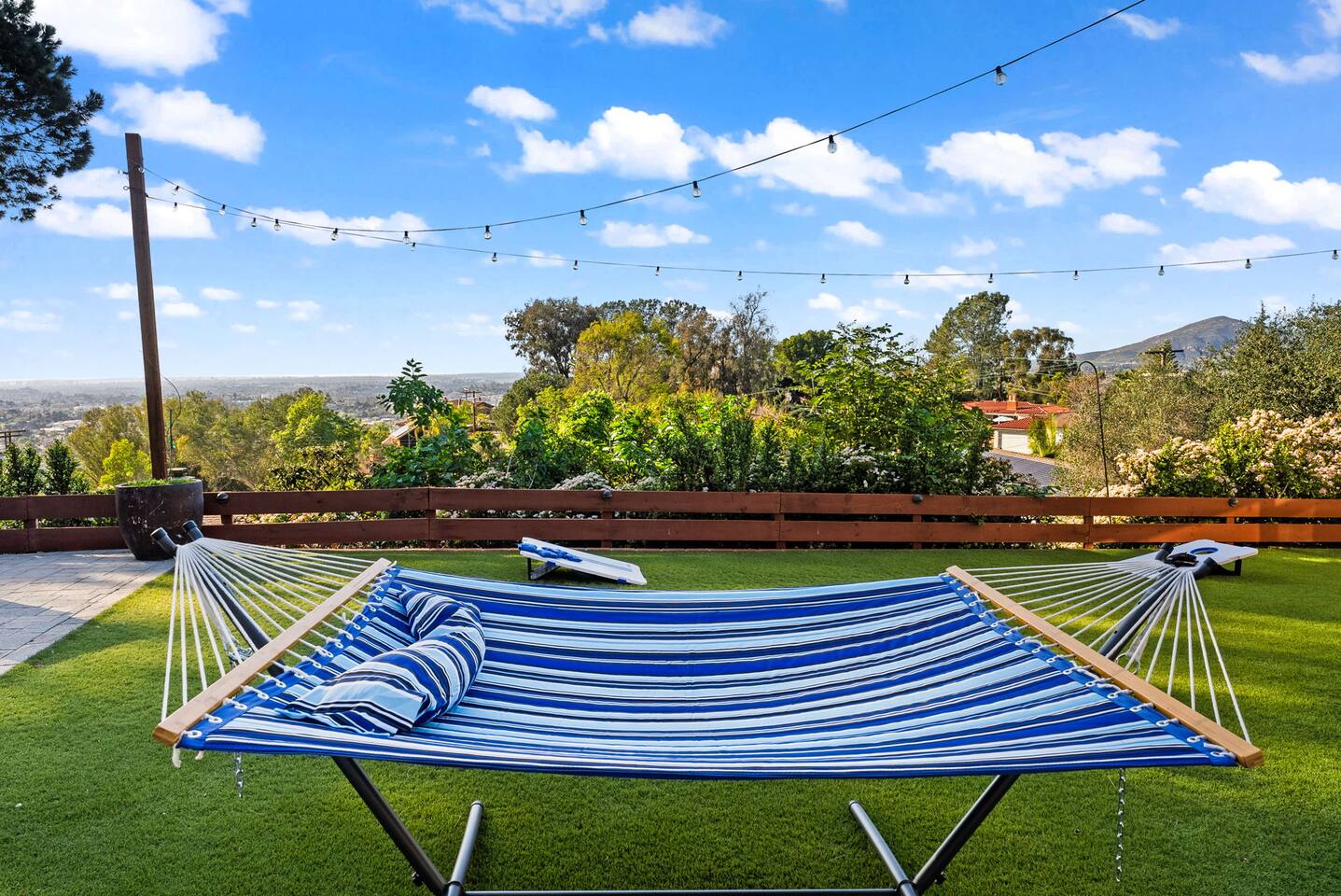 The backyard is all about relaxing and taking in the view. Sink into the hot tub once the sun goes down or during cooler winter nights, sway in the hammock, or challenge each other to a game of cornhole. End the night around the view fire pit, watching the lights of San Diego sparkle below.