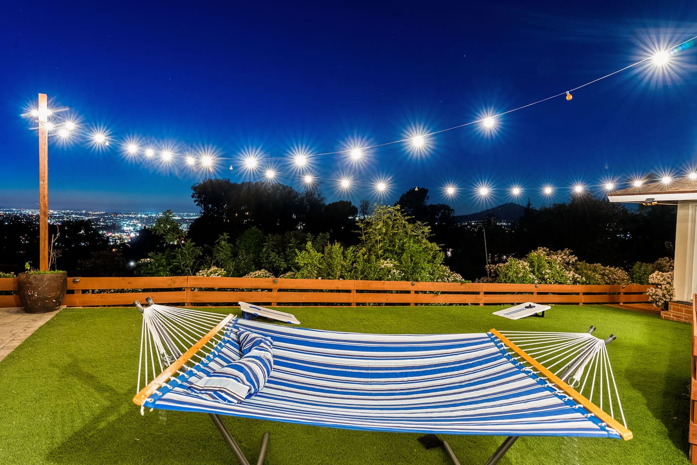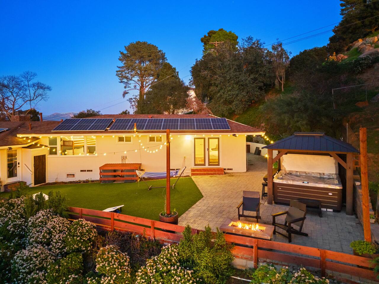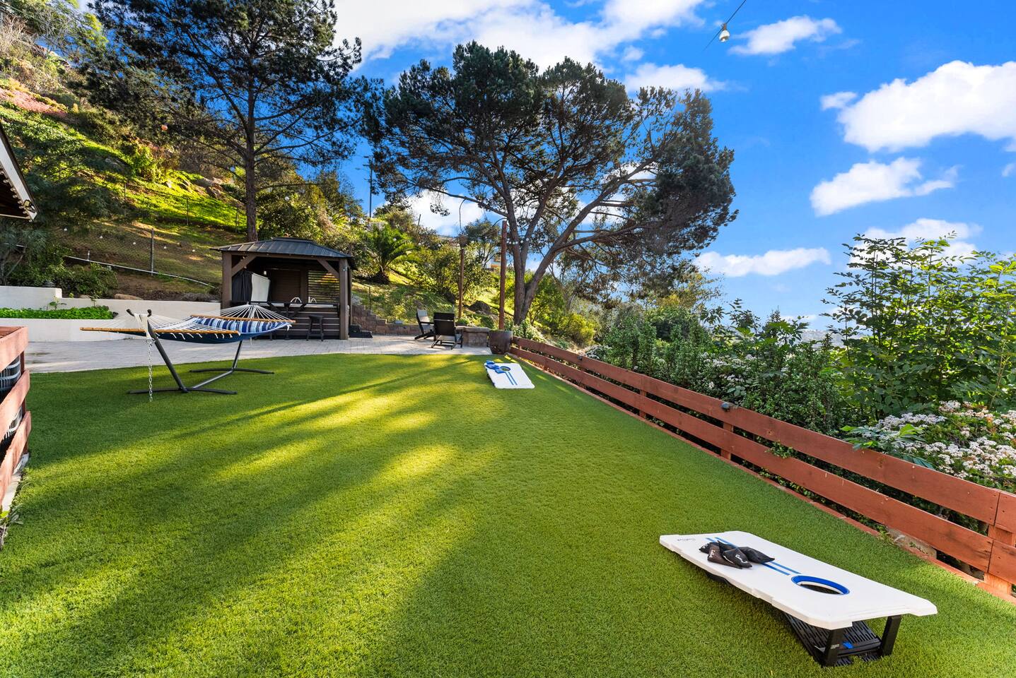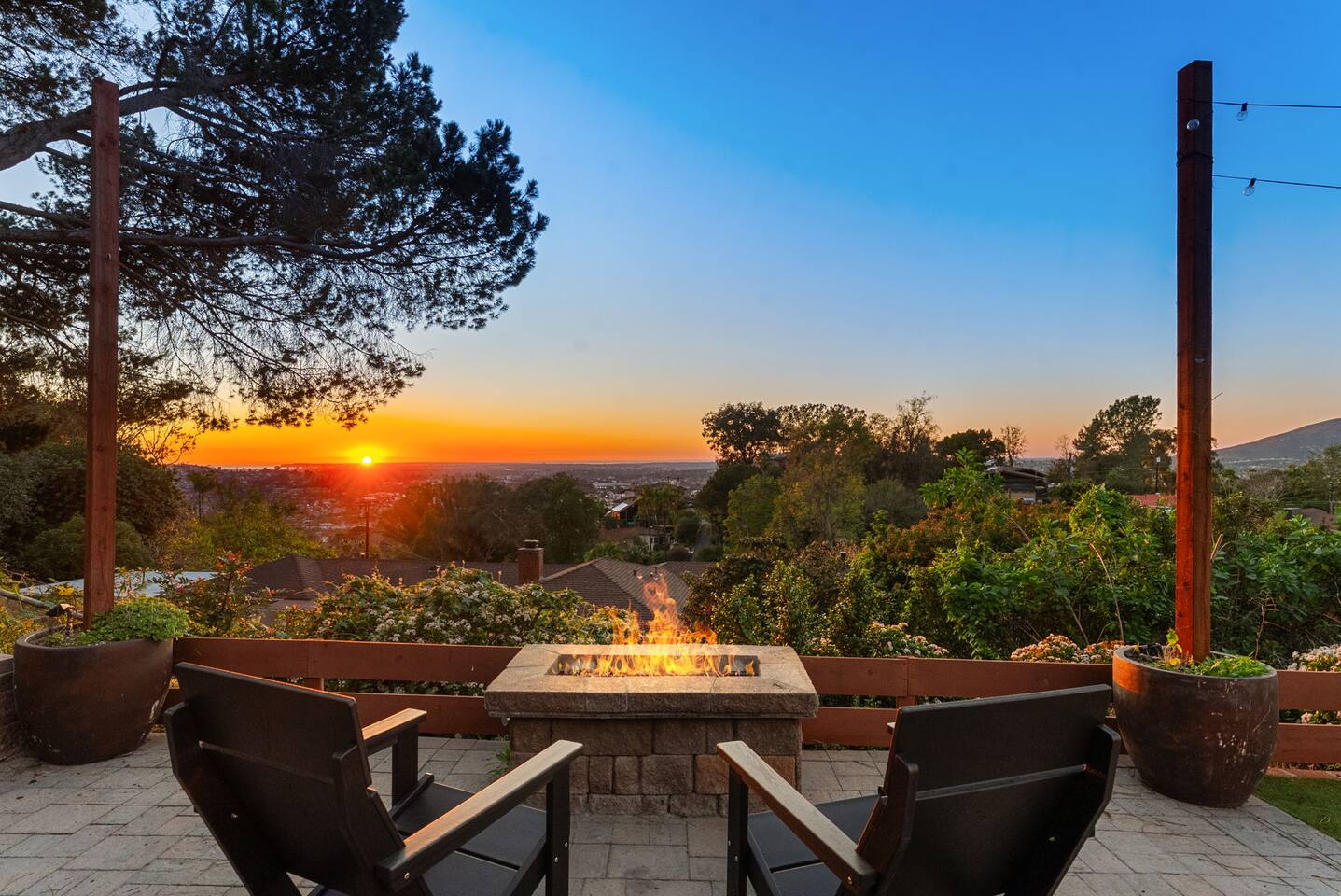 The backyard is all about relaxing and taking in the view. Sink into the hot tub once the sun goes down or during cooler winter nights, sway in the hammock, or challenge each other to a game of cornhole. End the night around the view fire pit, watching the lights of San Diego sparkle below.