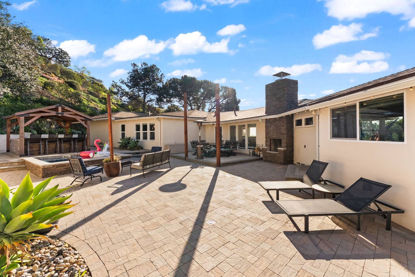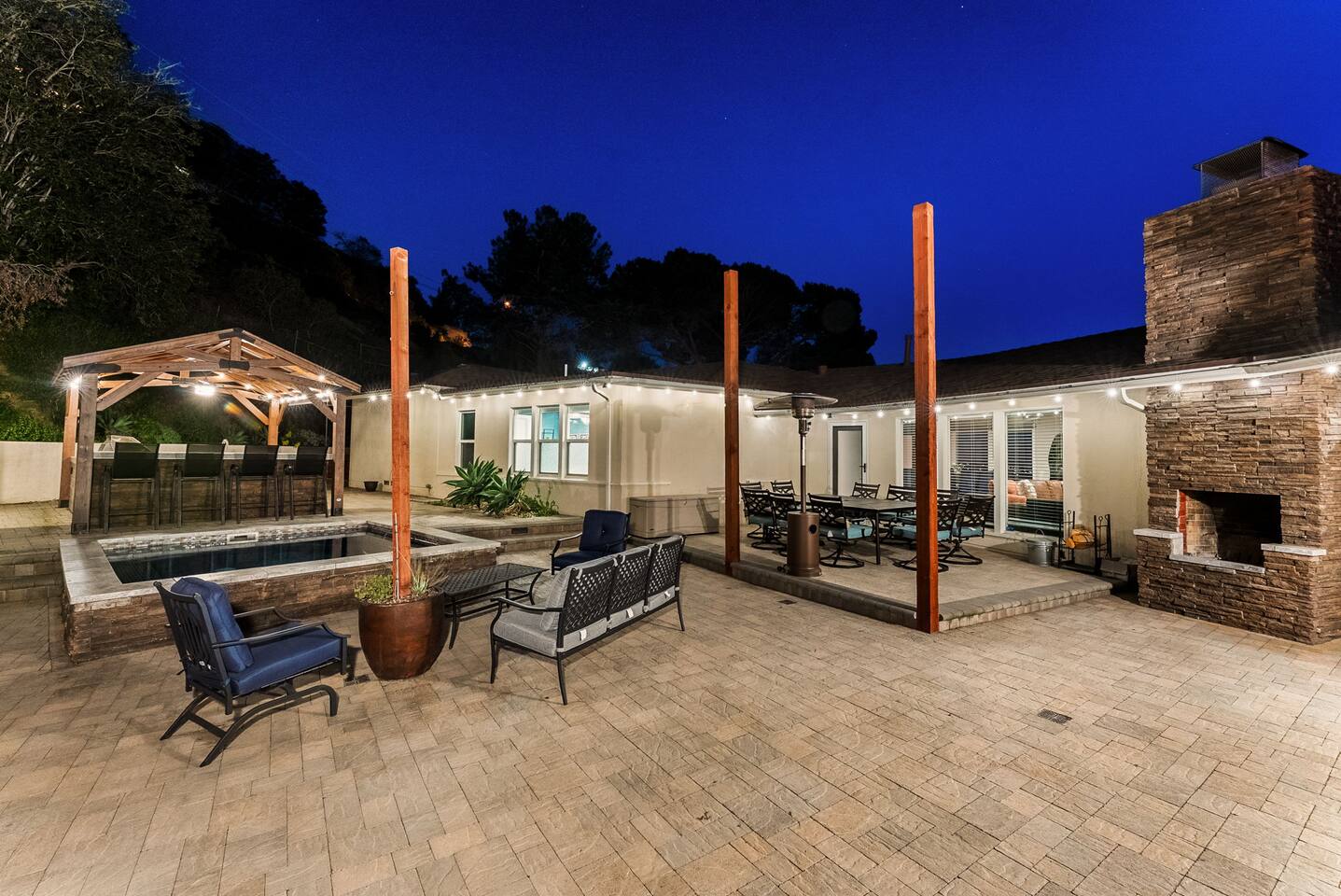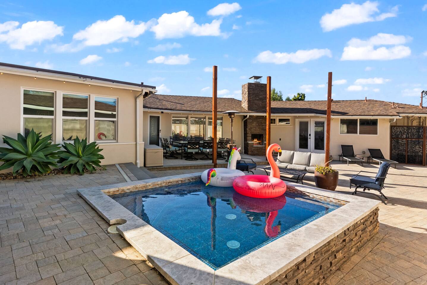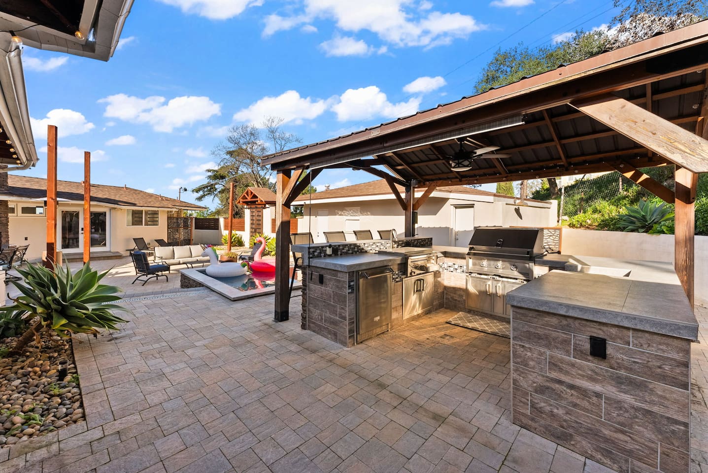 The courtyard is the social heart of the home. Here you’ll find the refreshing dipping pool—perfect for cooling off on hot summer days—alongside the outdoor kitchen and dining area. Gather for meals, grill together, and wind down by the outdoor fireplace as the sky changes color. It’s an inviting, central space made for togetherness.