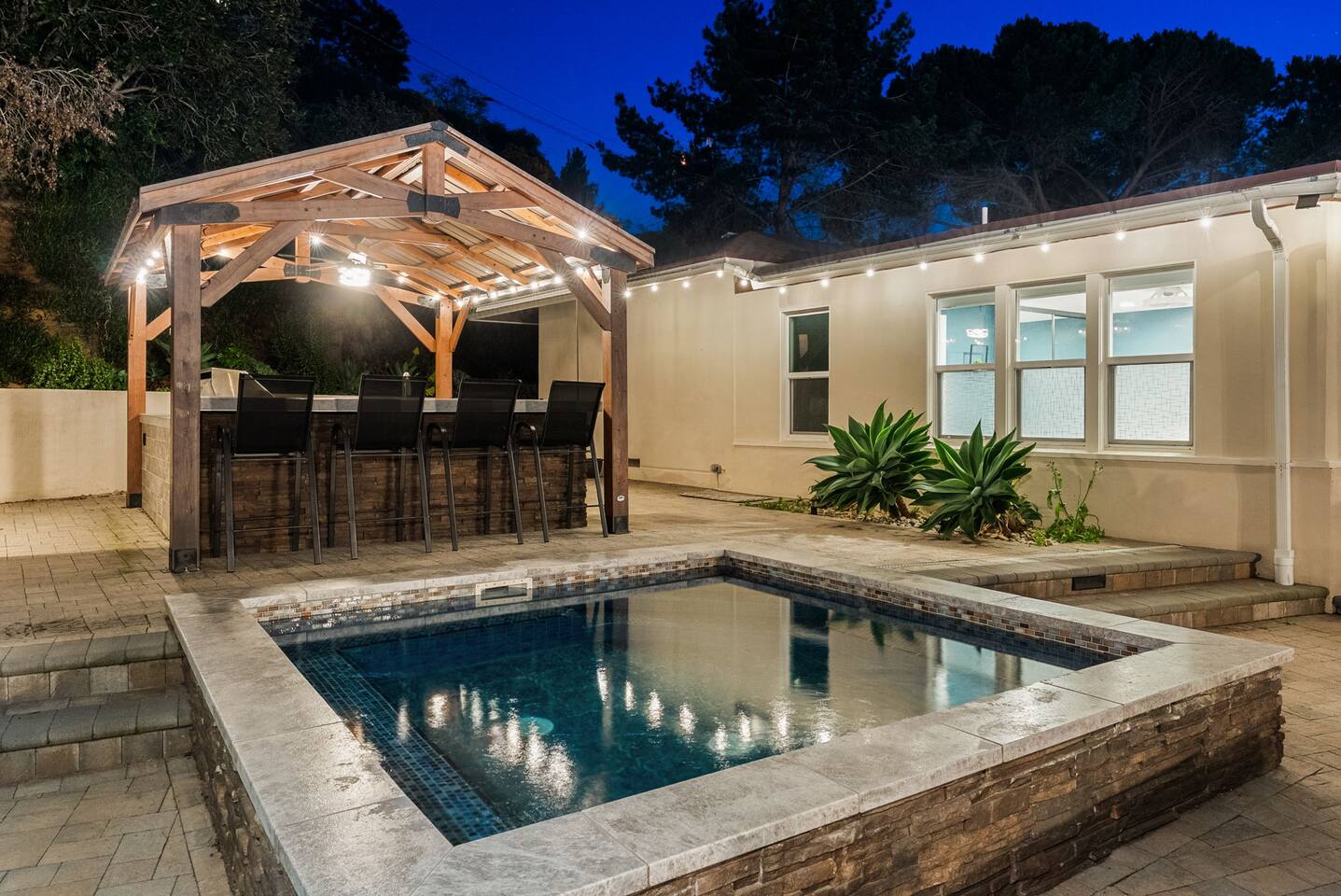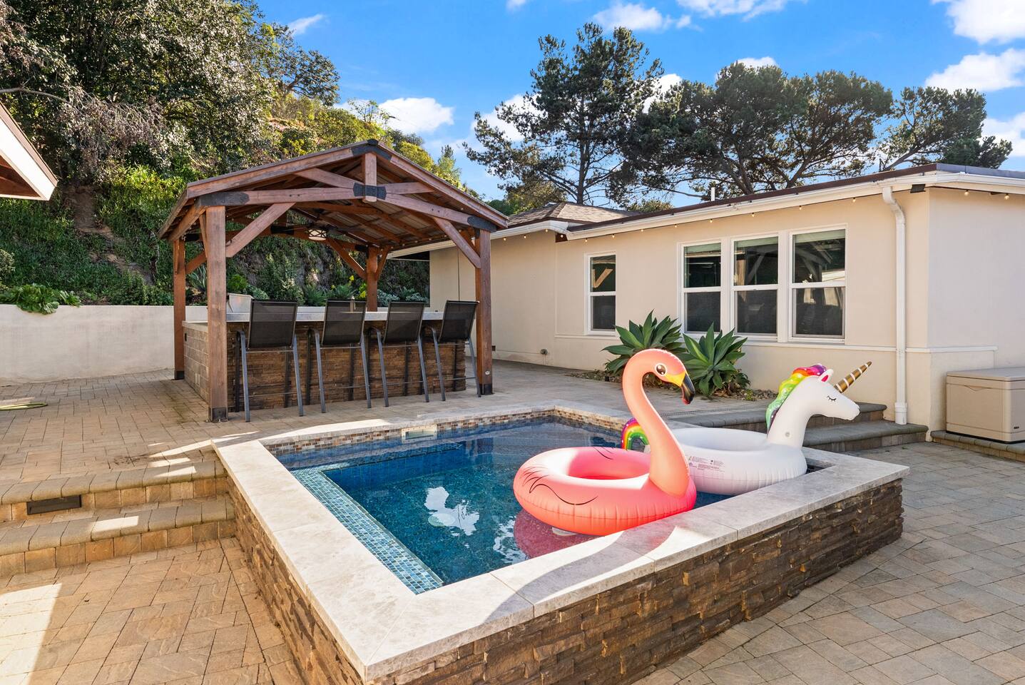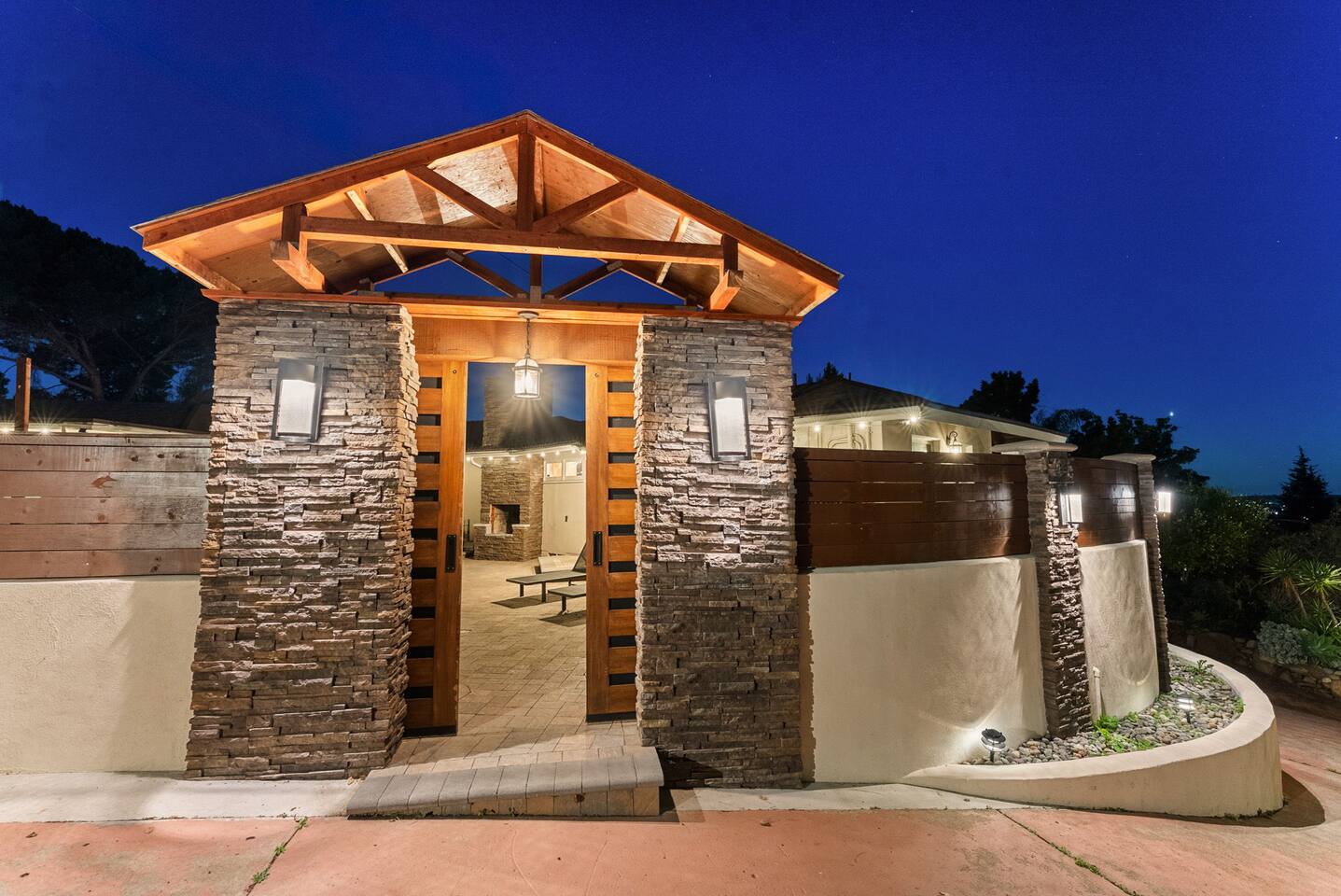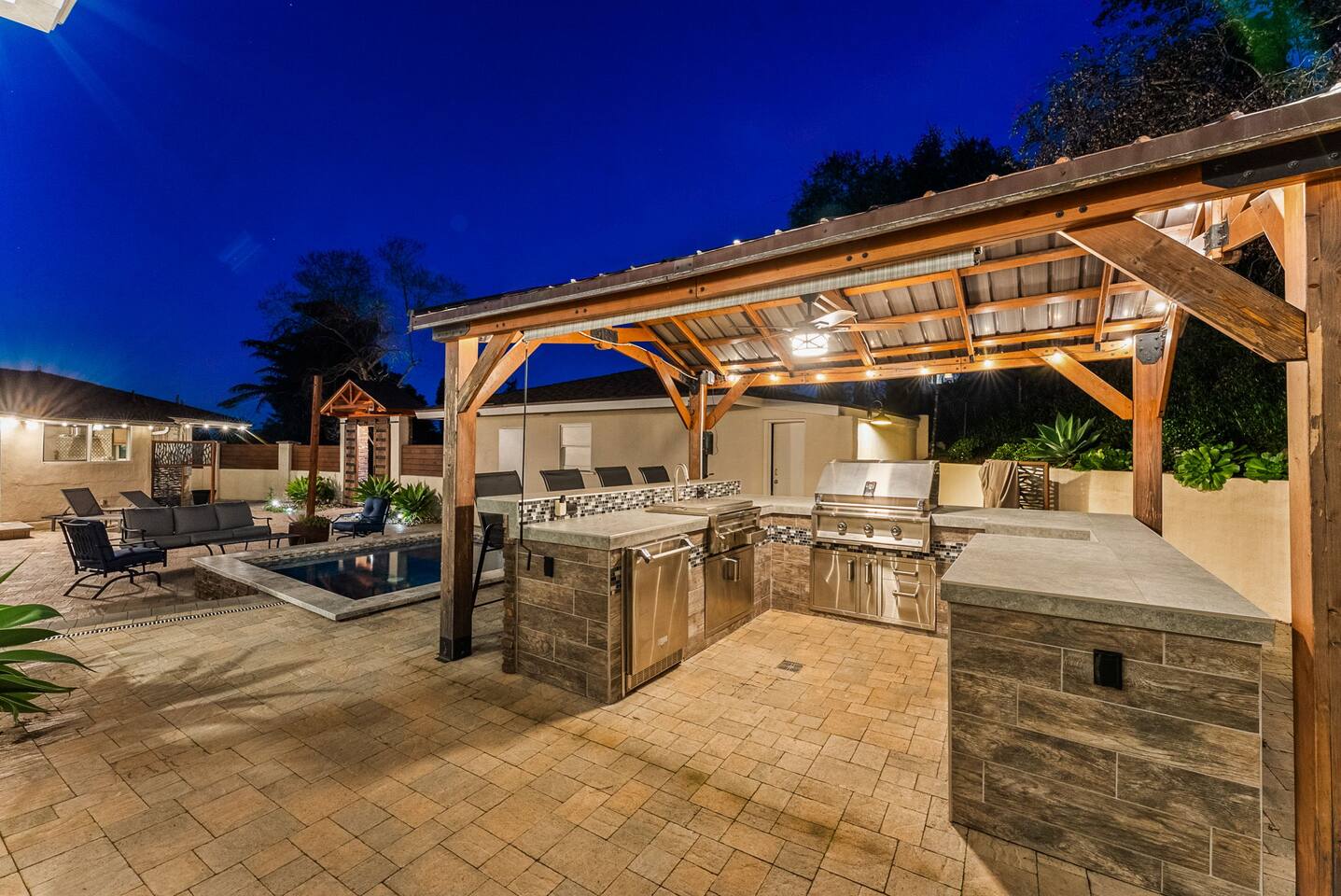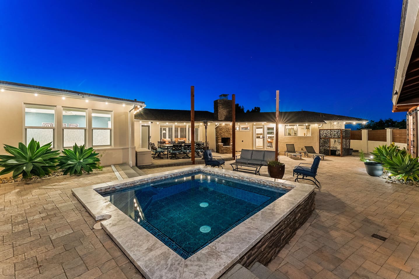 The courtyard is the social heart of the home. Here you’ll find the refreshing dipping pool—perfect for cooling off on hot summer days—alongside the outdoor kitchen and dining area. Gather for meals, grill together, and wind down by the outdoor fireplace as the sky changes color. It’s an inviting, central space made for togetherness.