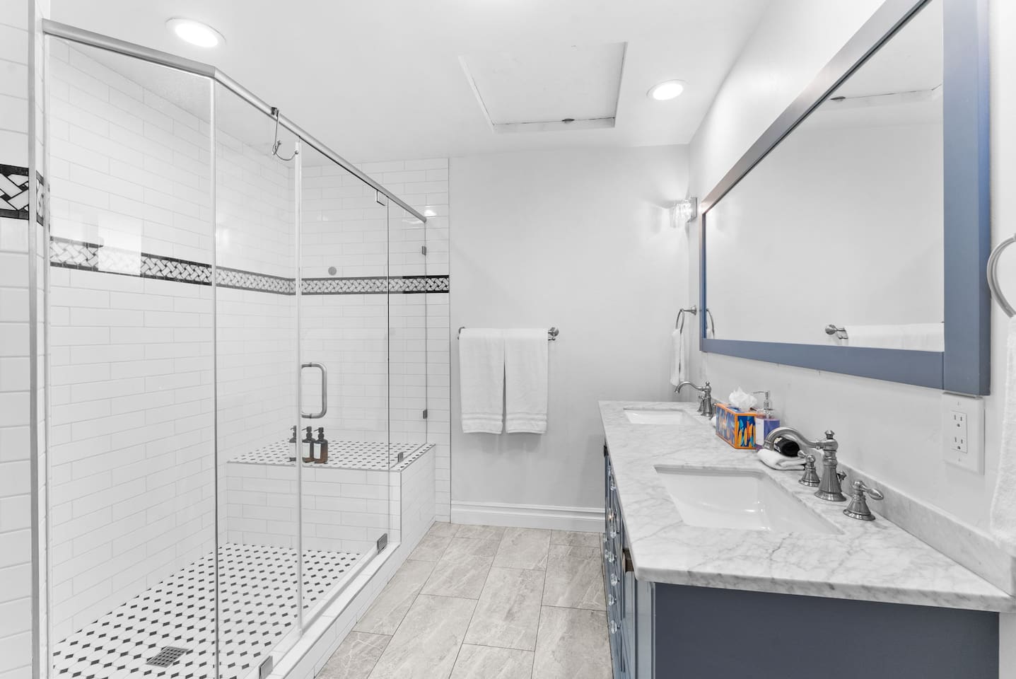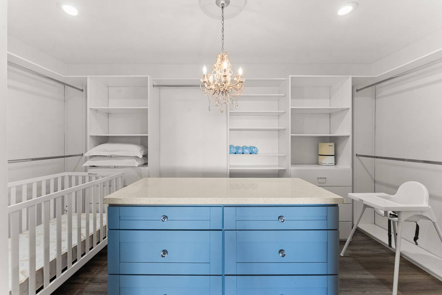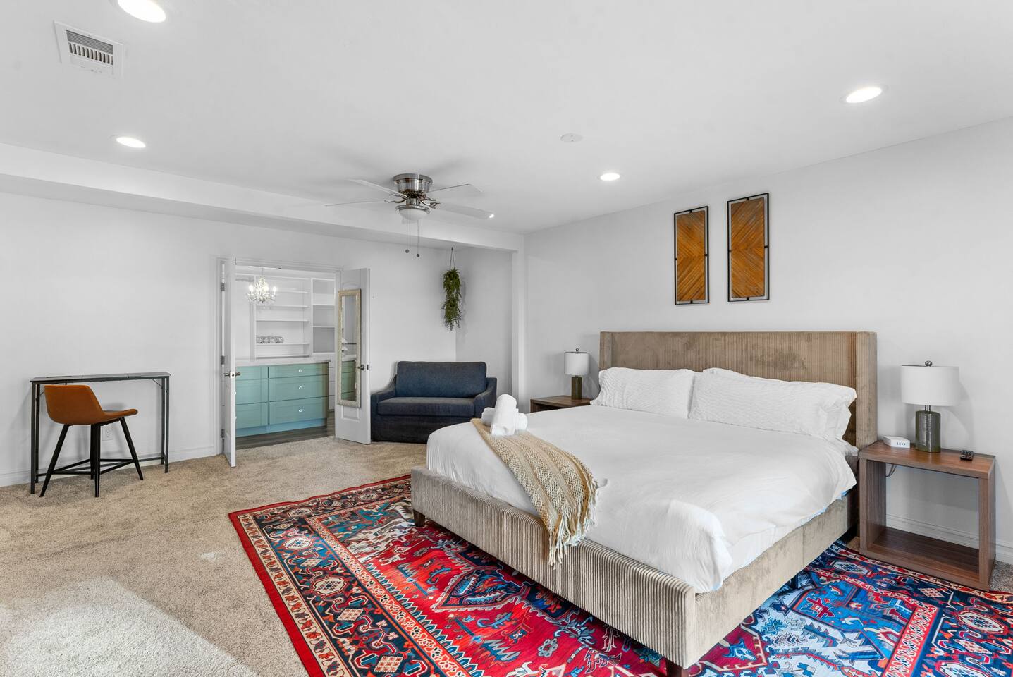 Bedroom 1: King bed, twin pull-out sofa, crib tucked into the walk-in closet area, and private ensuite bathroom