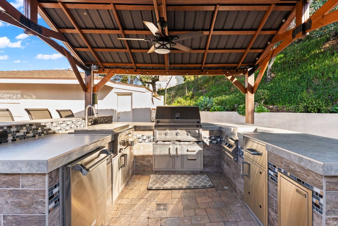 An additional full bathroom with a shower is located just off the kitchen and offers direct outdoor access, making it the perfect pool bath.