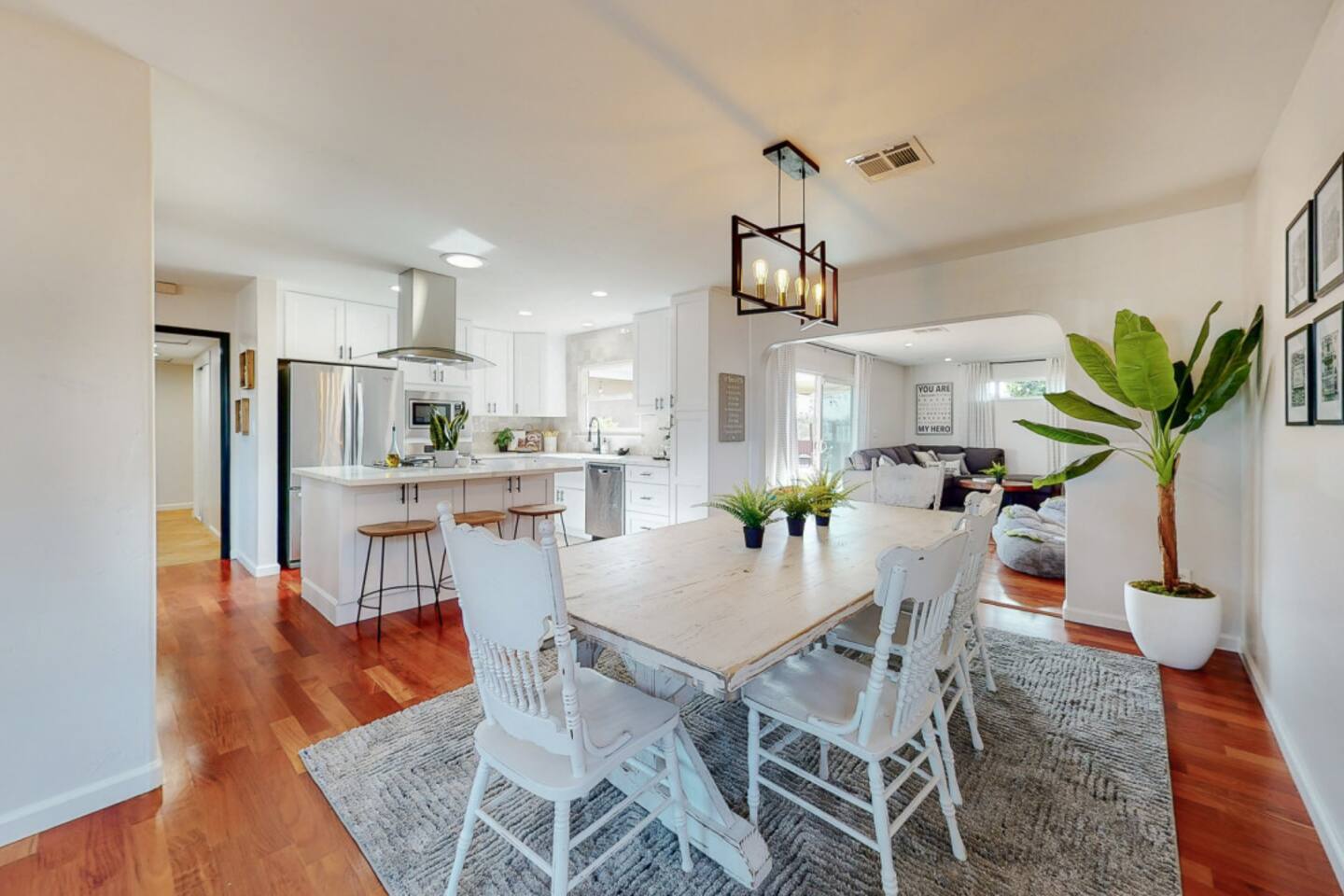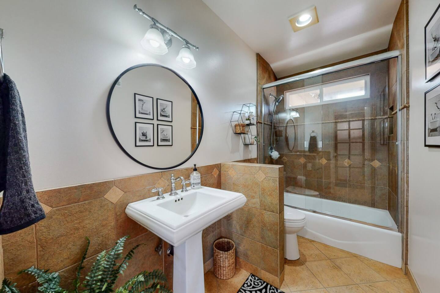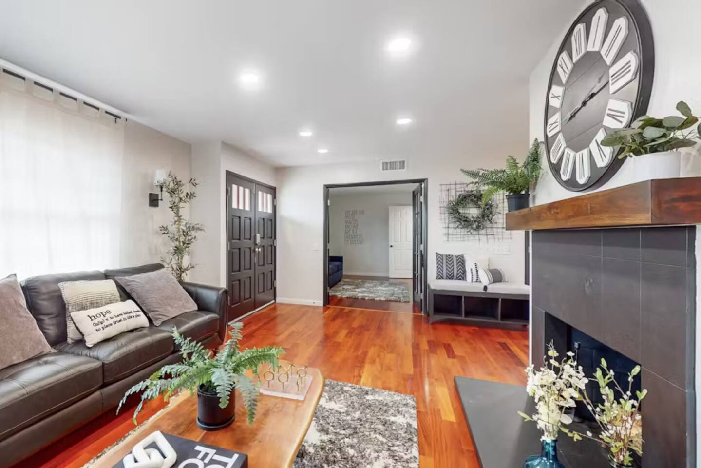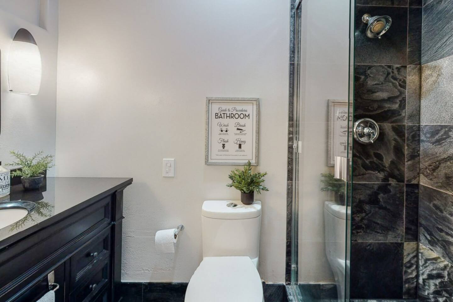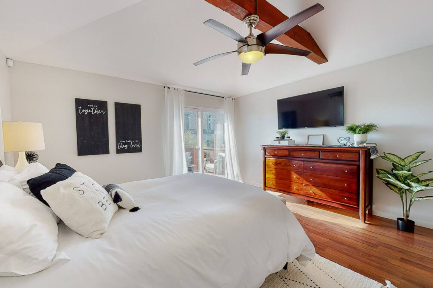 With an open floor plan, French doors, and Brazilian Cherry wood floors, this home exudes sophistication and comfort. Enjoy the updated chef's kitchen with upscale appliances, a large center island stovetop, and breakfast bar seating. The living area includes a kid's section with a book nook, child-size cushion seats, and a variety of toys and games to keep the little ones happy. The primary suite features vaulted ceilings and deck access, providing a serene space to unwind after exploring the city.