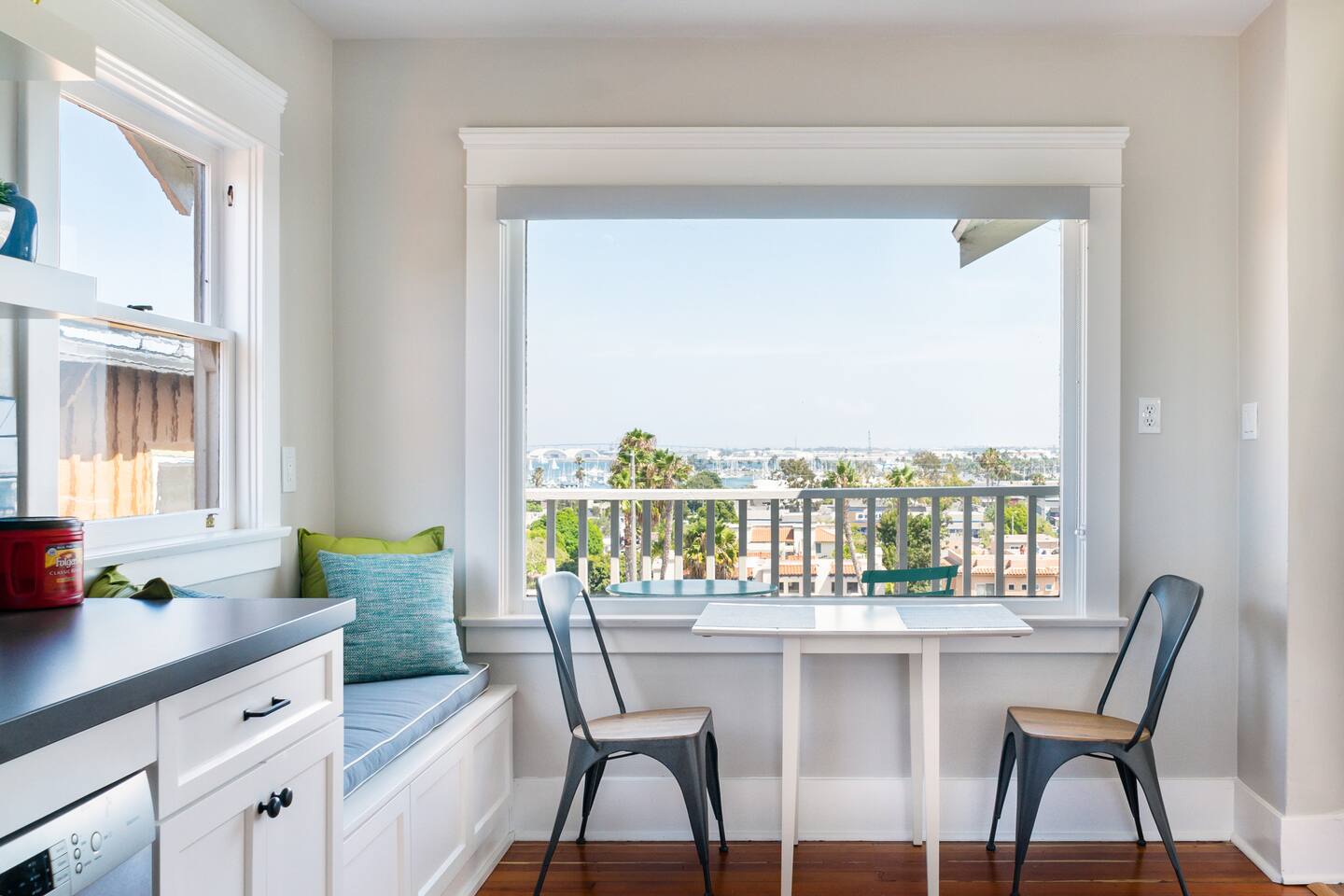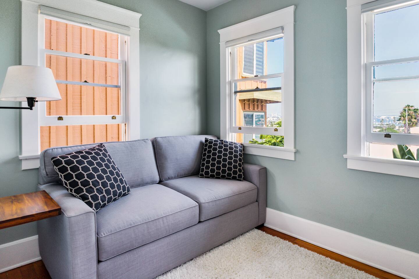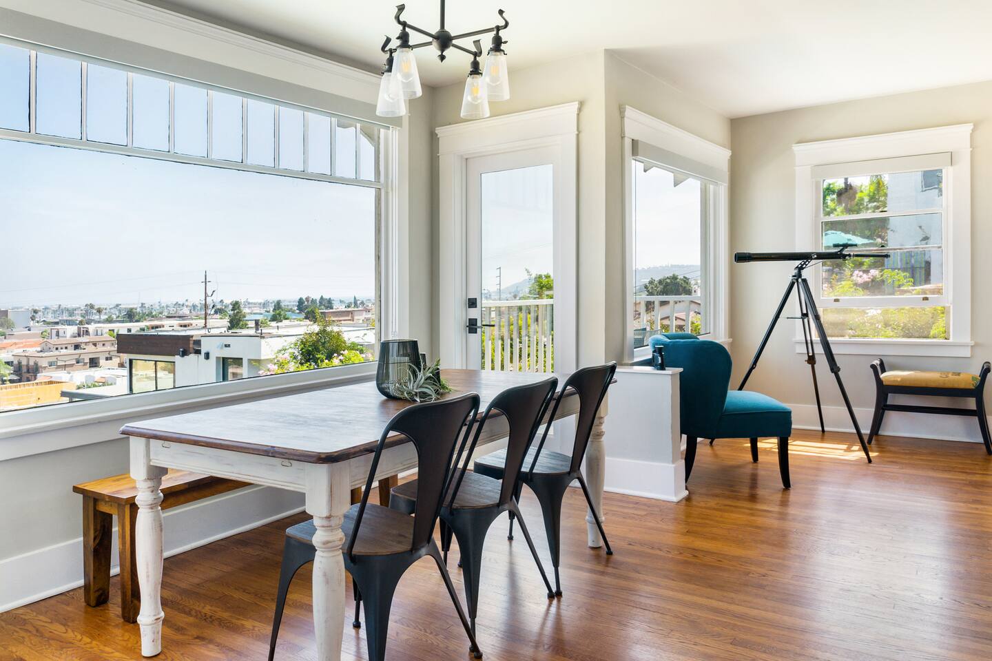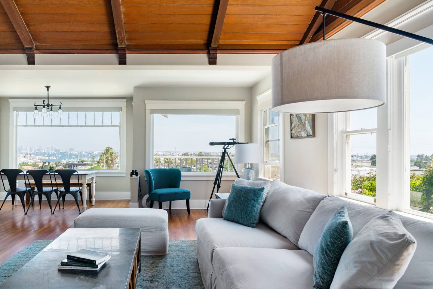 Upstairs includes one large open living space surrounded with windows and panoramic views of the bay, ocean, downtown skyline, mountains and Mexico.