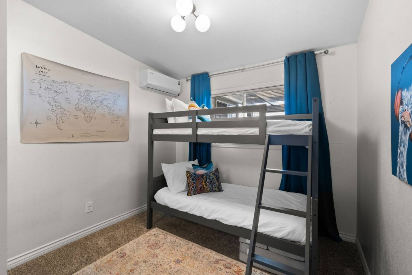 Bedroom 3: Bunk room with two twin beds and a twin size folding floor mattress