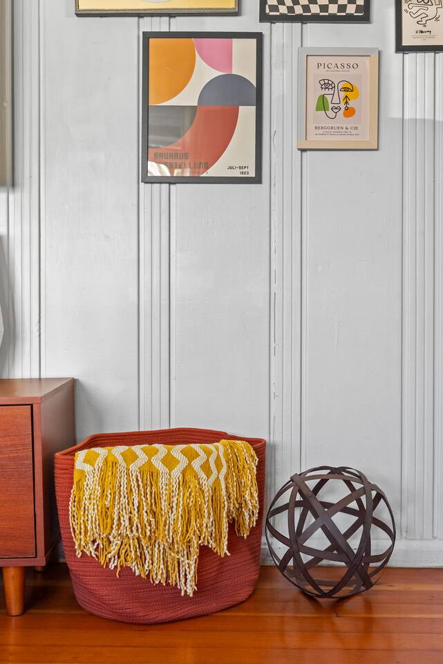 Step inside and you’ll find thoughtfully curated spaces that balance retro character with comfort and color. Both bedrooms feature queen beds, and there’s an additional queen sleeper sofa in the living room for extra guests. The fully equipped kitchen and cozy lounge areas make it easy to relax, cook, and unwind after a day exploring the city.
