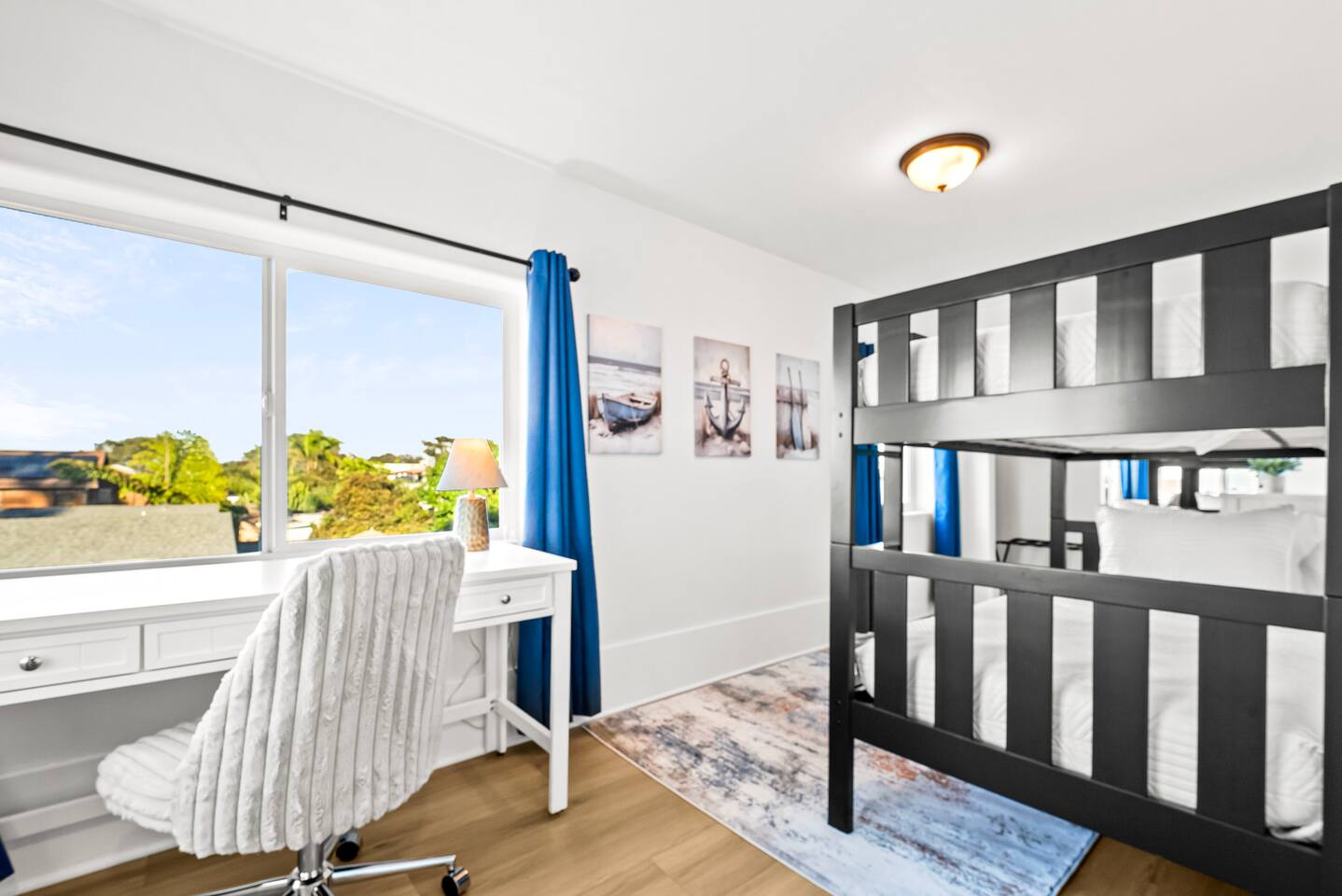 - Bedroom 4 (Upstairs): Bunk room with two twins and a desk overlooking the ocean