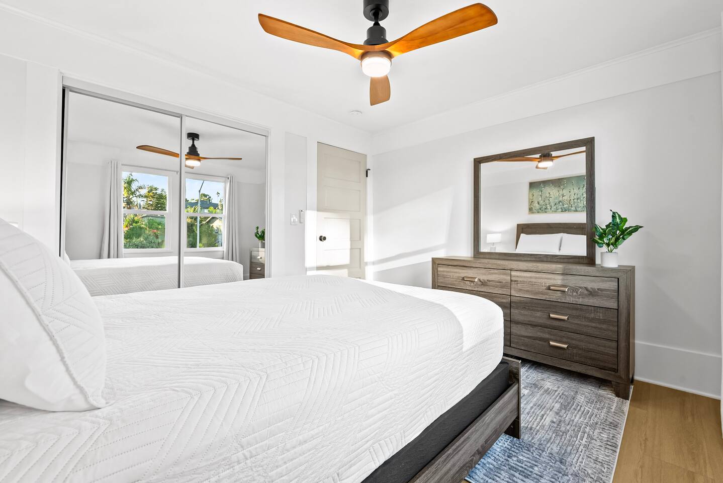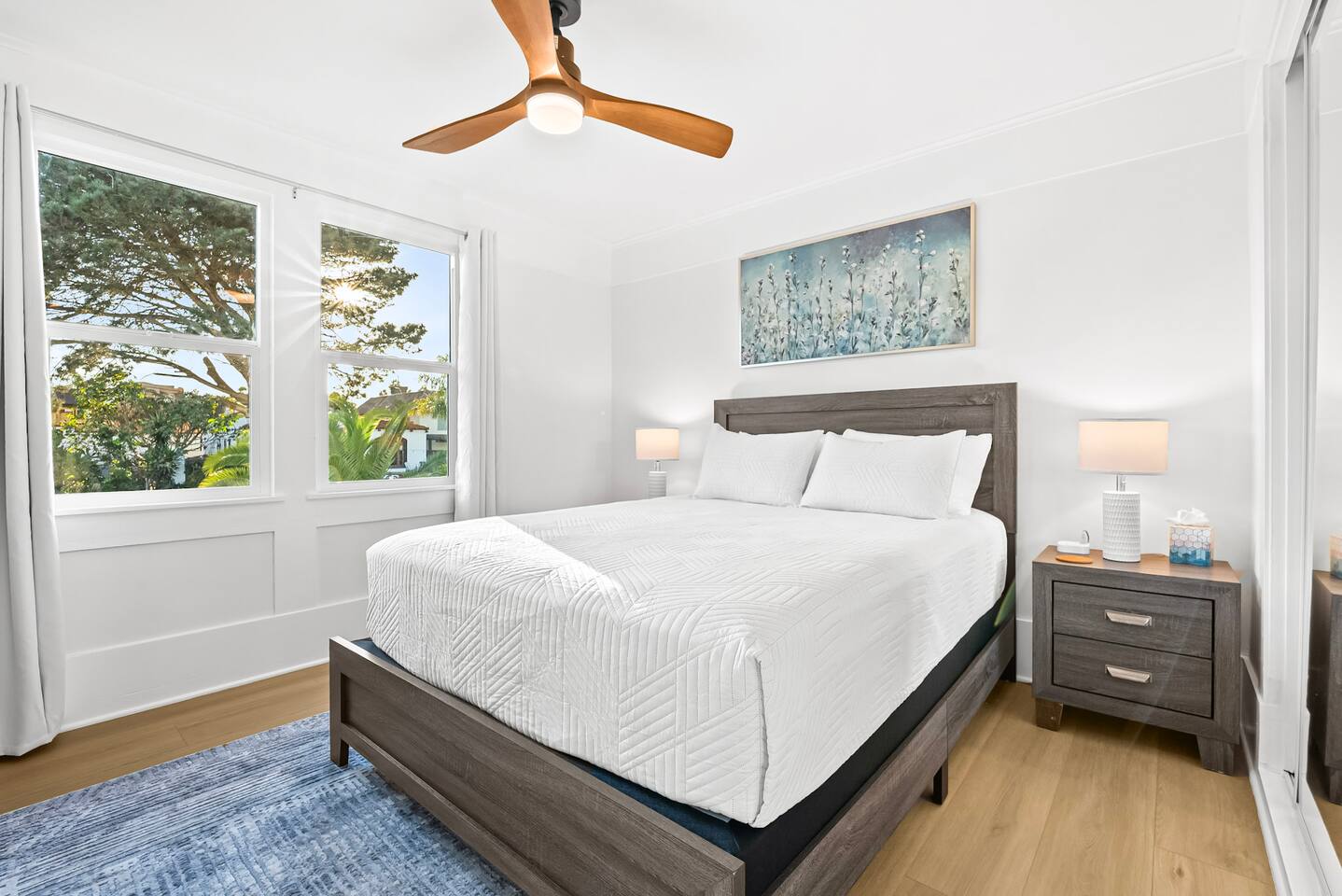 - Bedroom 1 (Upstairs): King suite with ocean views, ensuite spa-style bath, walk-in closet (ideal for a pack ’n play), built-in laundry area, and blackout shades