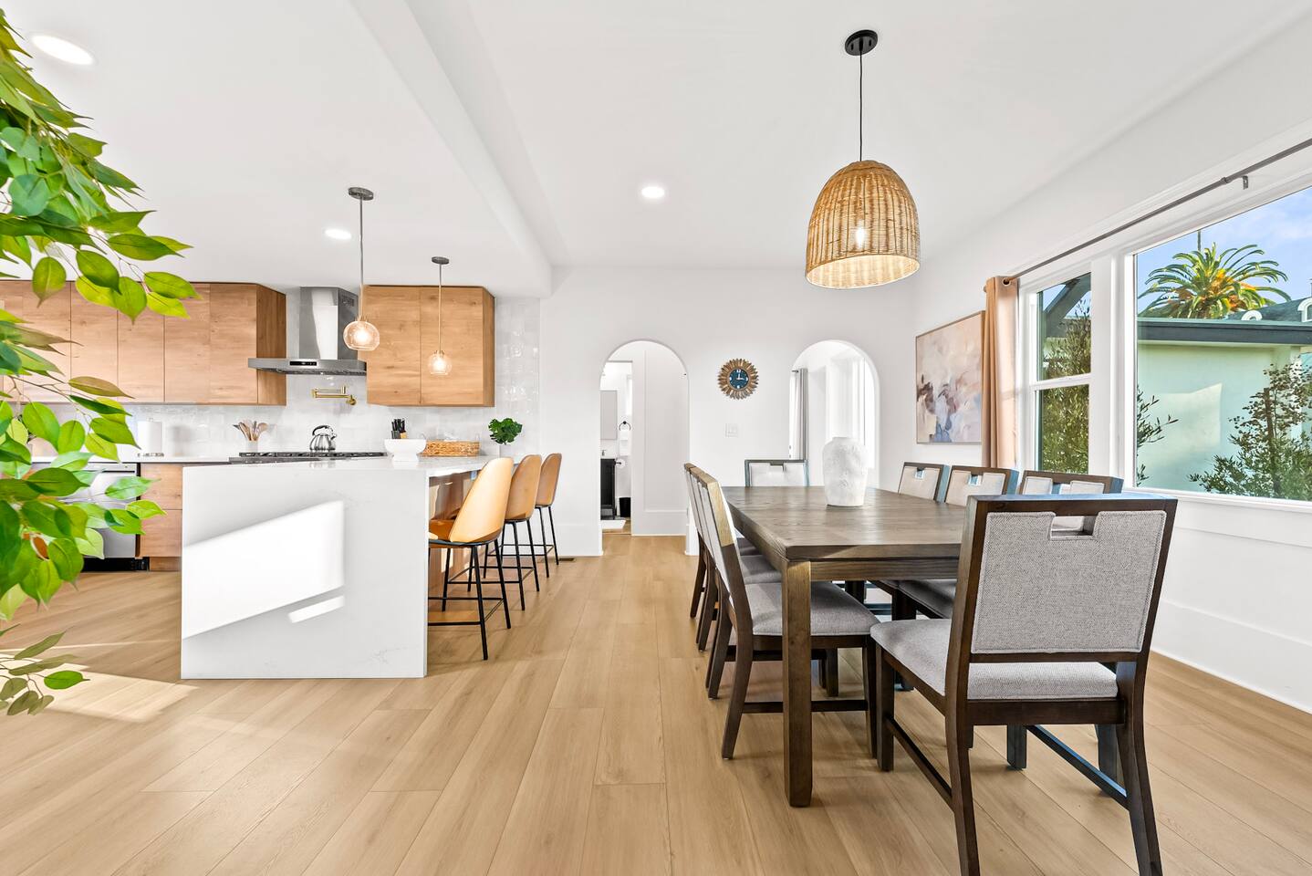 Just steps from the surf in vibrant Ocean Beach, this completely reimagined 2,448 sq. ft. residence offers the rare experience of entering a brand-new model home — yet with all the warmth and ease of a true coastal retreat. Renovated down to the studs, every material, finish, and detail was intentionally selected to create a luxurious haven with sweeping ocean views that frame your day from sunrise to sunset. Mornings begin with soft coastal light streaming through picture windows as you sip coffee and watch surfers carve the break below. Evenings bring golden skies, slow family meals in the banquet-style dining area, and SeaWorld’s nightly fireworks glimmering over the Pacific — a magical, exclusive backdrop for your stay.